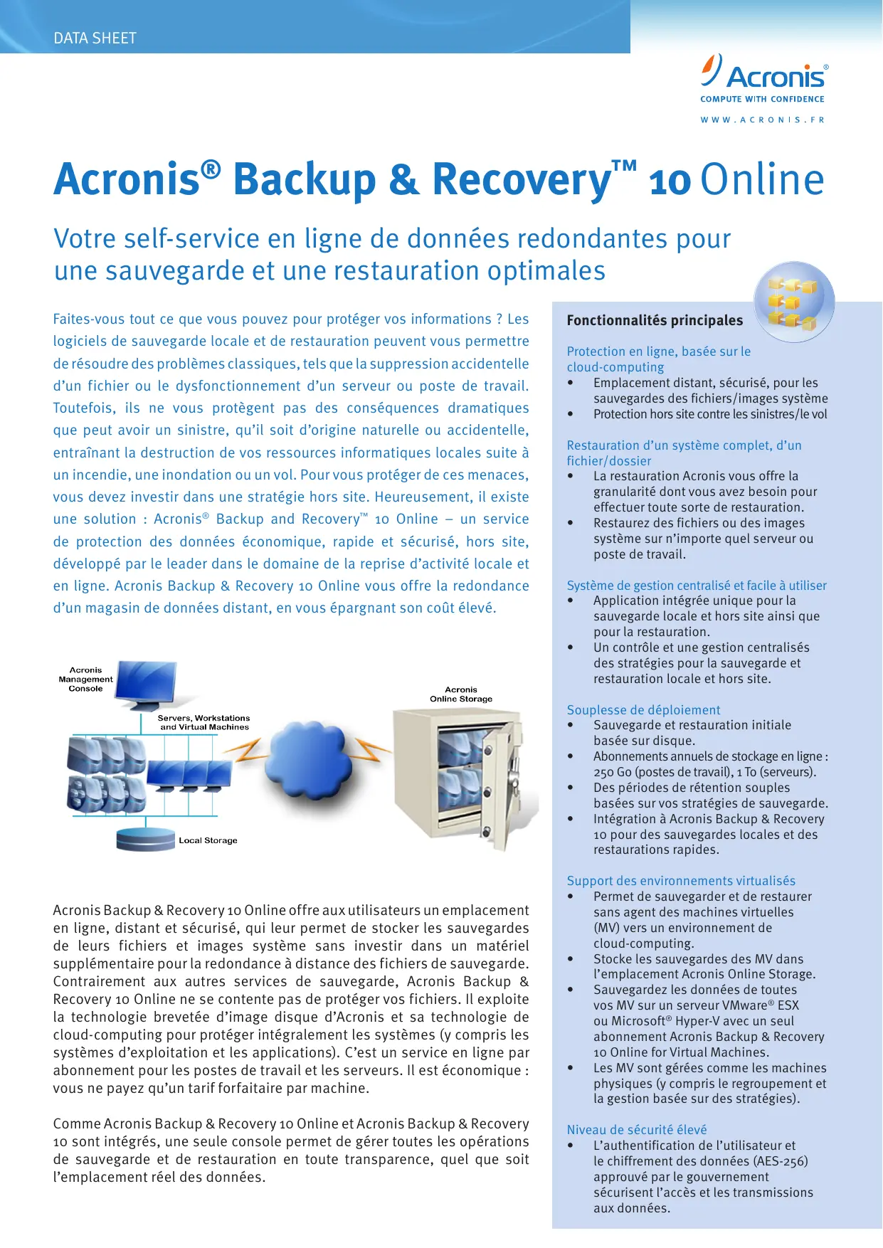 - L’authentification de l’utilisateur et le chiffrement des données (AES-256) approuvé par le gouvernement sécurisent l’accès et les transmissions aux données. DATA SHEET Sauvegardes locales Sauvegardes en ligne Acronis Backup & Recovery 10 Acronis Backup & Recovery 10 Online Acronis Backup & Recovery 10 + Acronis Backup & Recovery 10 Online Pour une protection optimale, sauvegardez vos données en ligne ! Sauvegardez des fichiers spécifiques ou une image complète de votre système. Acronis Backup & Recovery 10 Online vous permet de sauvegarder des fichiers et des dossiers spécifiques, des machines virtuelles ou une image complète de votre système, y compris son système d’exploitation, ses applications et ses informations de configuration. Vous pouvez restaurer ces fichiers, des machines virtuelles ou des images système sur n’importe quel serveur ou poste de travail. Vous n’avez donc plus besoin de disposer d’un matériel de remplacement similaire avant de pouvoir les utiliser. Support des environnements virtualisés. Acronis supporte vos systèmes actuels avec une sauvegarde et une restauration sans agent des machines virtuelles dans l’environnement de cloud-computing. Les sauvegardes des machines virtuelles sont stockées dans l’emplacement Acronis Online Storage lorsqu’Acronis Backup & Recovery 10 Online for Virtual Machines est utilisé. L’abonnement annuel inclut 2 To d’espace de stockage en ligne, la maintenance et un nombre illimité de machines virtuelles par hôte. Sauvegarder les données de toutes les machines virtuelles sur un serveur physique VMware ESX ou Microsoft Hyper-V ne requiert qu’un seul abonnement Acronis Backup & Recovery 10 Online for Virtual Machines par hôte. Par ailleurs, vous pouvez gérer vos machines virtuelles, comme vos machines physiques, à partir de la même console de gestion. Une gestion et un contrôle complets. Les entreprises peuvent définir des stratégies de sauvegarde locale et en ligne pour leurs postes de travail et leurs serveurs, à partir d’une console client unique et centralisée. Que les machines soient sauvegardées localement, via Acronis Backup & Recovery 10, à distance, via Acronis Backup & Recovery 10 Online ou à la fois localement et à distance, les utilisateurs peuvent gérer toutes les options de protection de leurs données à partir d’une seule application. Simplicité d’utilisation. Le service Acronis Backup & Recovery 10 Online utilise l’interface graphique renommée d’Acronis. La convivialité de cette interface a été sans cesse améliorée afin d’optimiser encore davantage cette simplicité d’utilisation, et ce, depuis près de dix ans. Les utilisateurs d’Acronis Backup & Recovery 10 seront immédiatement productifs car ils retrouveront la console qu’ils apprécient et qu’ils ont l’habitude d’utiliser. Les nouveaux utilisateurs trouveront qu’Acronis Backup & Recovery 10 Online est incroyablement simple à configurer et à utiliser. Même les utilisateurs les moins expérimentés peuvent créer des plans de sauvegarde et de restauration professionnels et sophistiqués qui leur permettront de restaurer leurs données et leurs systèmes complets dès qu’ils en auront besoin. Une seule console permet de gérer en toute transparence les opérations de sauvegarde (locale et en ligne) et de restauration, quel que soit l’emplacement réel des données. DATA SHEET Sécurité et confidentialité des données approuvées par le gouvernement. La confidentialité des données est un point critique des entreprises, c’est pourquoi Acronis a décidé d’opter pour le plus haut niveau de sécurité. Le chiffrement AES 256 bits approuvé par le gouvernement est disponible en standard avec tout abonnement à Acronis Backup & Recovery 10 Online. De plus, chaque utilisateur peut créer une clé privée unique qui assure que lui et lui seul peut accéder à ses informations (vivement recommandé). Ni Acronis ni aucune autre personne ne peut accéder à vos données. Une souplesse de protection des données inégalée. Le service Acronis de protection des données en ligne donne aux responsables informatiques la possibilité d’équilibrer leurs besoins en termes de protection locale ou en ligne en fonction de systèmes ou des groupes, sans avoir à acquérir d’onéreuses mises à niveau pour aligner leurs deux systèmes de protection. Acronis supporte toutes les situations et combinaisons de situations suivantes :