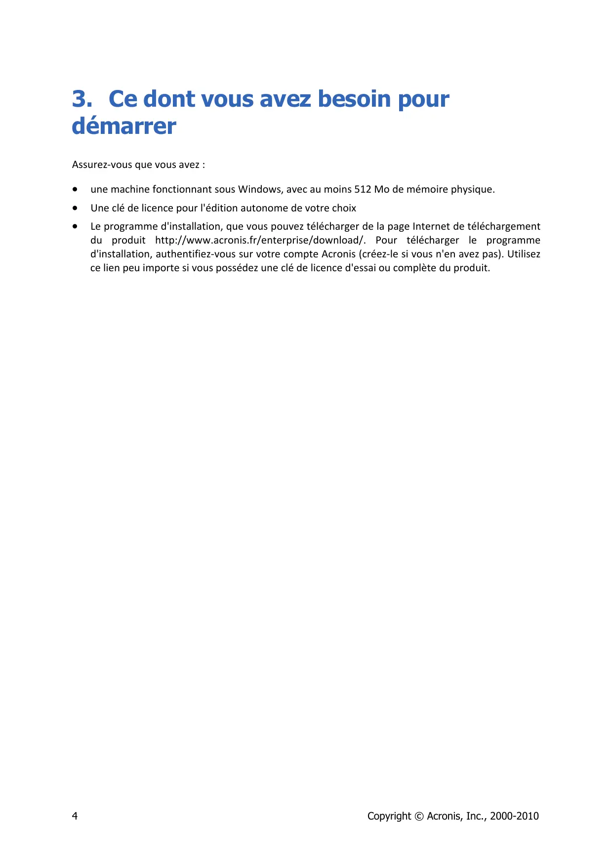 une machine fonctionnant sous Windows, avec au moins 512 Mo de mémoire physique. Une clé de licence pour l'édition autonome de votre choix Le programme d'installation, que vous pouvez télécharger de la page Internet de téléchargement du produit http://www.acronis.fr/enterprise/download/. Pour télécharger le programme d'installation, authentifiez‐vous sur votre compte Acronis (créez‐le si vous n'en avez pas). Utilisez ce lien peu importe si vous possédez une clé de licence d'essai ou complète du produit. Copyright © Acronis, Inc., 2000-2010