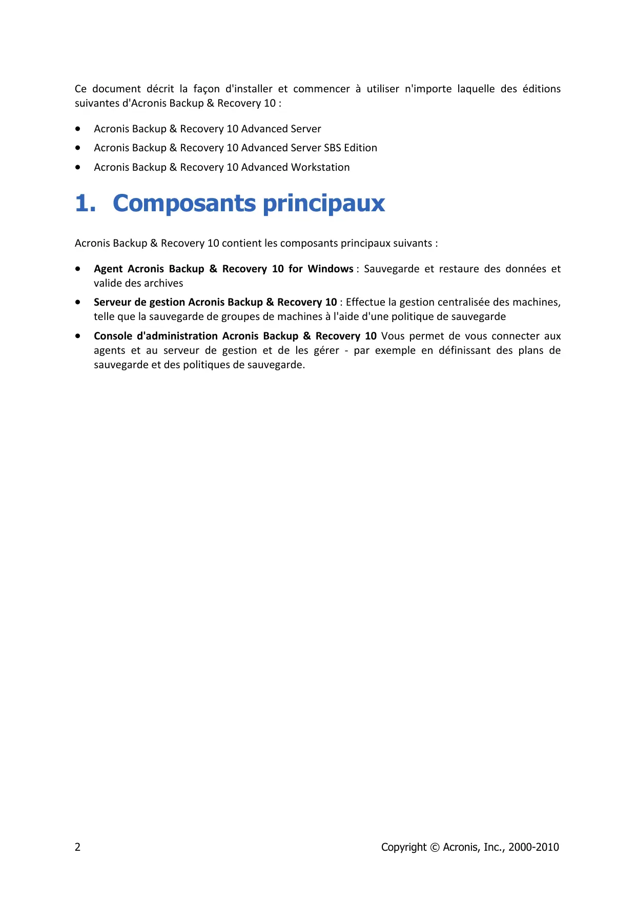 Acronis® Backup & Recovery ™ 10 Advanced Editions Guide de démarrage rapide Ce document décrit la façon d'installer et commencer à utiliser n'importe laquelle des éditions suivantes d'Acronis Backup & Recovery 10 :