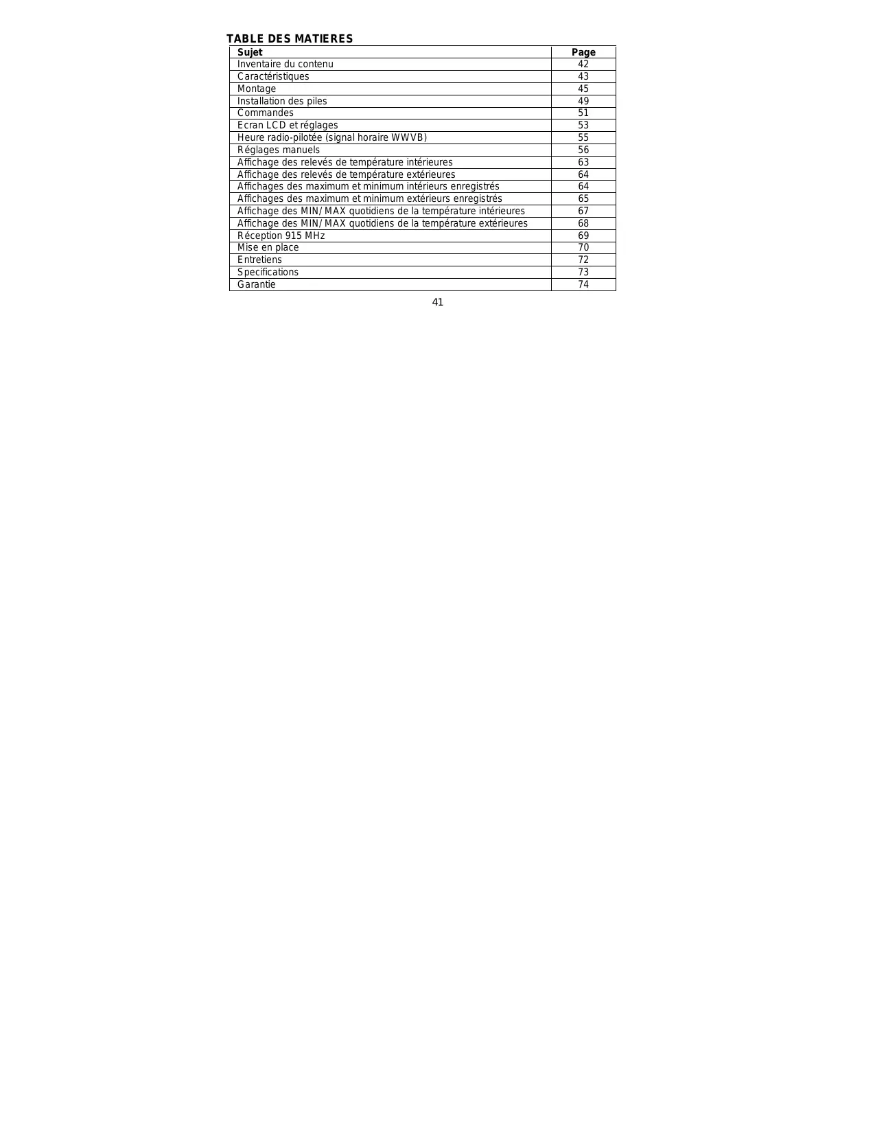 | Affichage des MIN/ MAX quotidiens de la température extérieures | 68 |