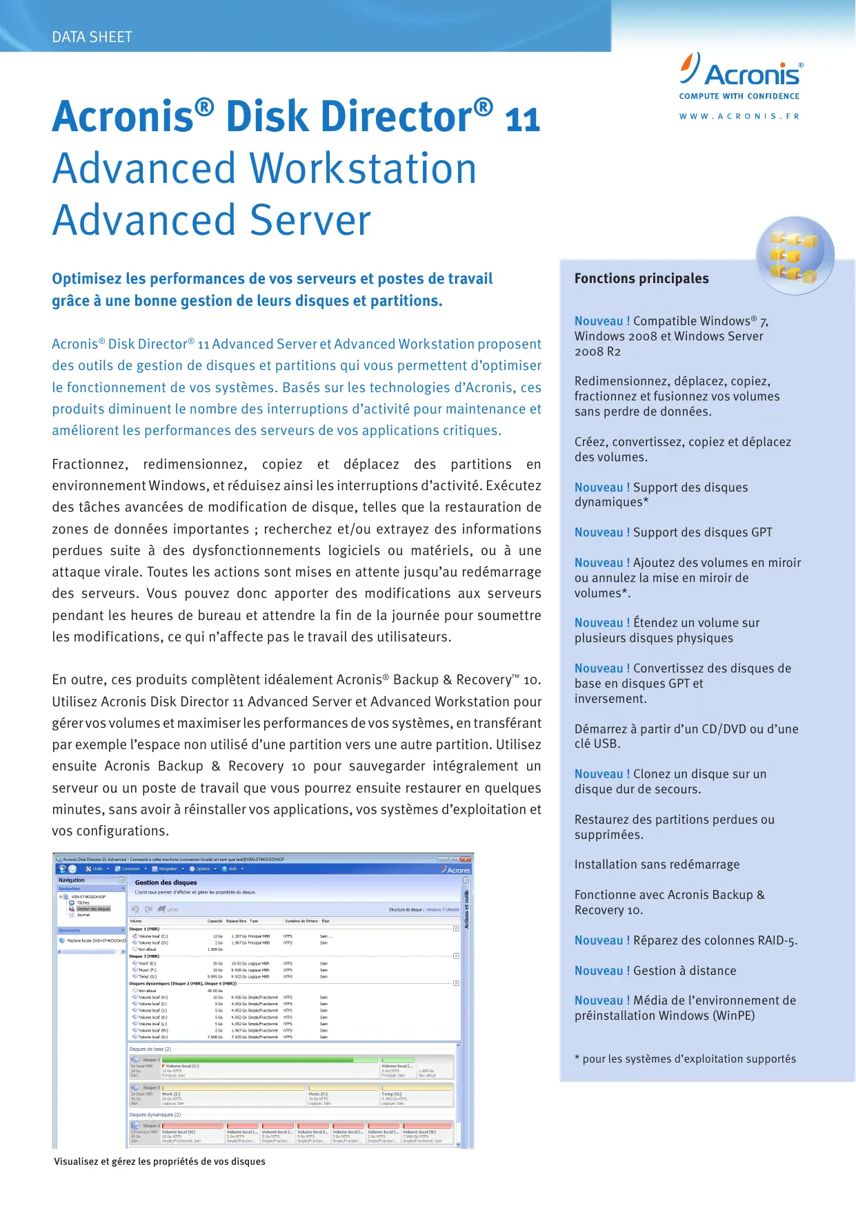 - pour les systèmes d’exploitation supportés Visualisez et gérez les propriétés de vos disques DATA SHEET Fonctionnalité Description Nouveau ! Gérez vos disques et vos volumes avec une souplesse sans égale ! Effectuez une grande variété d’opérations de gestion de disques et de volumes :