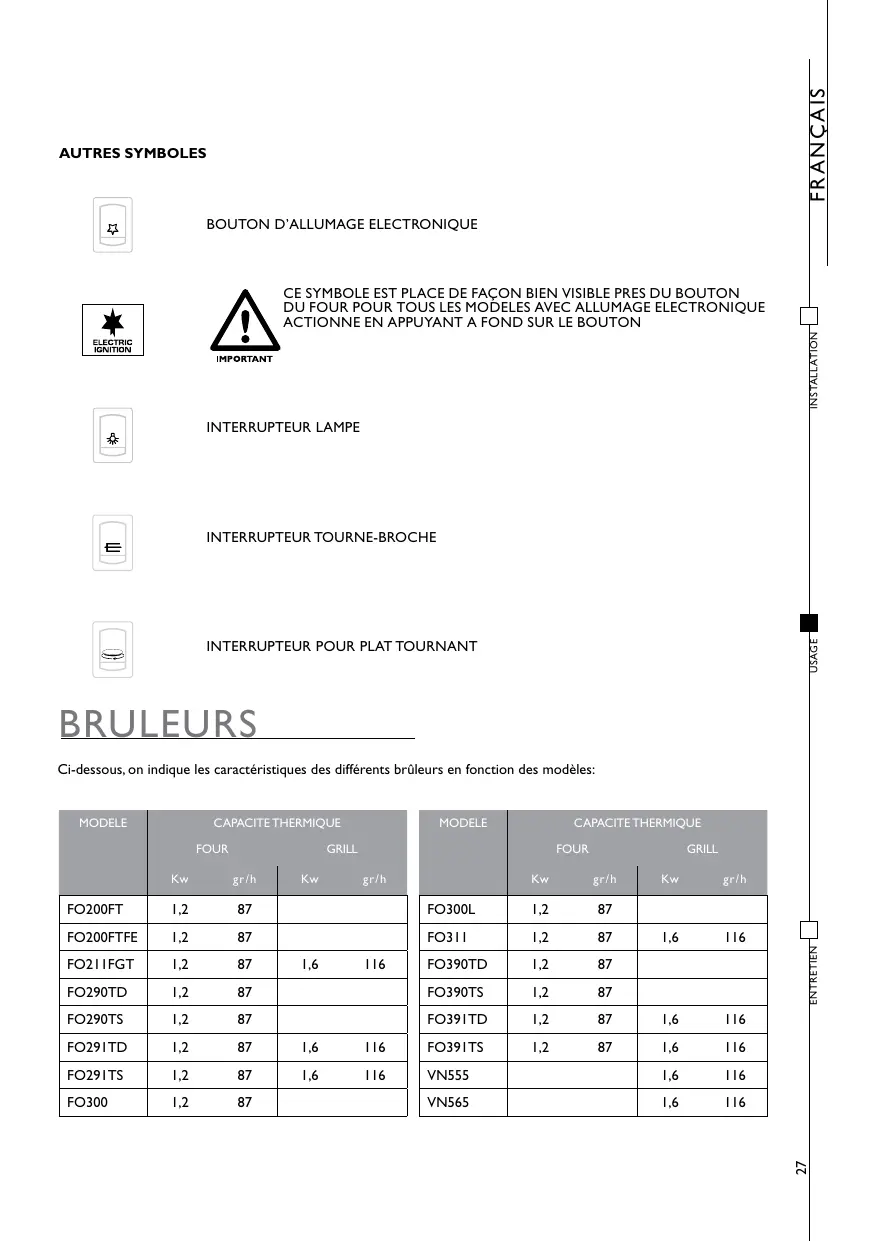 Les symboles suivants indiquent le brûleur correspondant au bouton de commande. REMARQUE: selon le modèle les boutons et les symboles peuvent être différents. CE SYMBOLE SE TROUVE PRES DU BOUTON DU BRULEUR FOUR CE SYMBOLE SE TROUVE PRES DU BOUTON DU BRULEUR GRIL Les symboles suivants indiquent les réglages qui correspondent à la position du bouton. REMARQUE: Des modèles différents pourraient avoir des symboles et des boutons différents. ENTRETIEN GAZ FERME GRANDE FLAMME PETITE FLAMME INTERRUPTEUR TOURNE-BROCHE USAGE BRULEURS Ci-dessous, on indique les caractéristiques des différents brûleurs en fonction des modèles: CAPACITE THERMIQUE MODELE CAPACITE THERMIQUE GRILL
