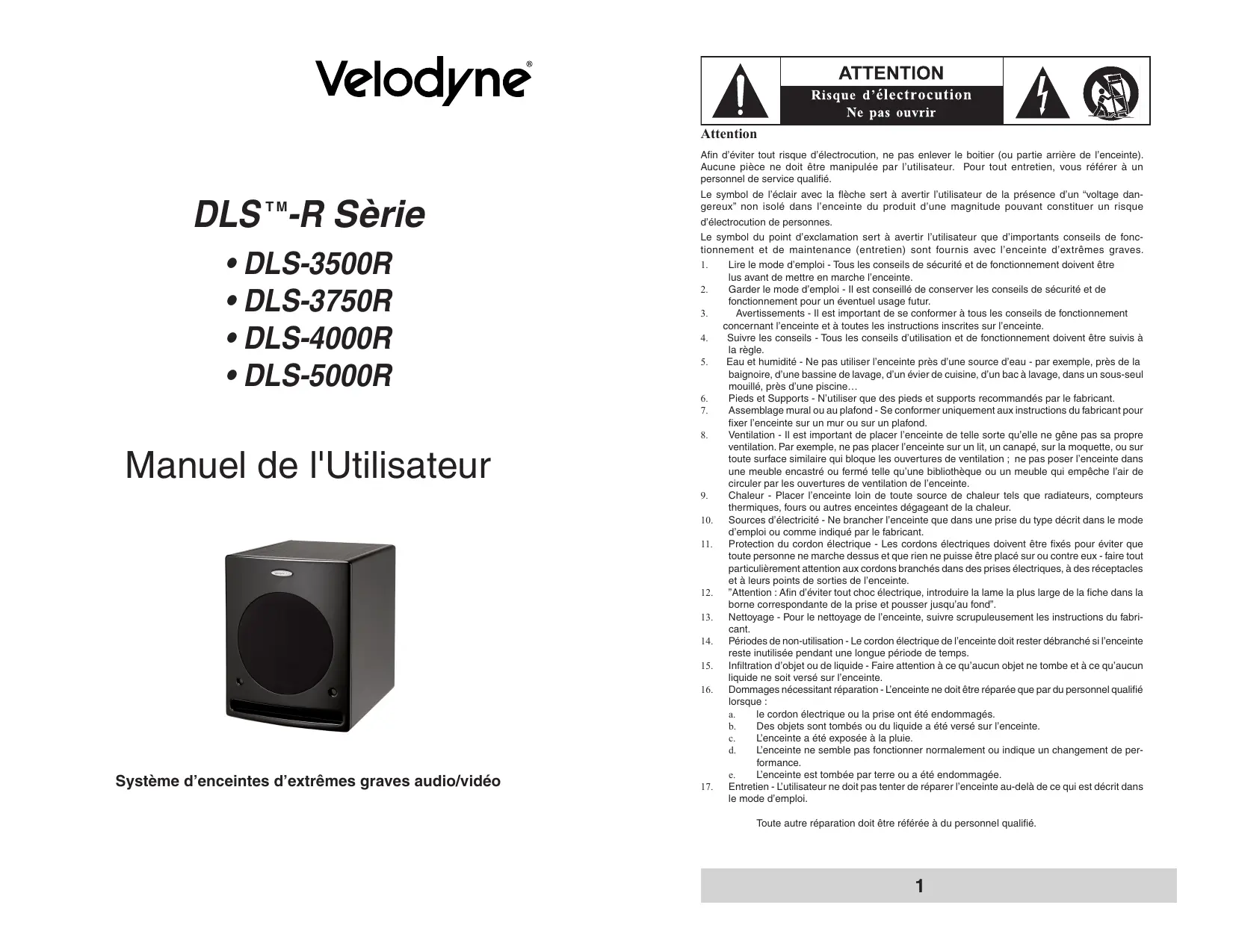 Nous vousprésentons nos félicitations pour avoir acheté un caisson d'extrêmes graves à distance (DLSTM-R) Velodyne Distorsion Limiting SystemTM. Ce système est à la pointe du progrès en matière de reproduction de basses fréquences. Veuillez lire et suivre les instructions ci-dessous pour assurer le fonctionnement approprié et sécuritaire du système.