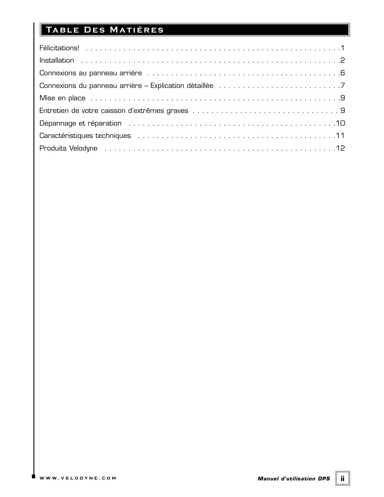 F é l i c i ta t i o n s Félicitations pour votre achat d’un système d’extrêmes graves Velodyne Digital Power Slot™ (DPS). Ce système est à la pointe du progrès en matière de reproduction de basses fréquences. Veuillez lire et suivre les instructions ci-dessous pour assurer le fonctionnement approprié et sécuritaire du système. Avertissement! Afin d'éviter les risques d'incendie et d'électrocution, n'exposez pas cet équipement à la pluie ou à l'humidité. Pour éviter les risques d'électrocution, n'ouvrez pas l'enceinte des haut-parleurs ni le couvercle du châssis d'amplificateur. Veuillez tenir compte de tous les avertissements qui se trouvent sur l'équipement lui-même. Il n'y a pas de pièces réparables par l'utilisateur à l'intérieur. Pour toutes questions concernant la réparation, consultez un concessionnaire Velodyne autorisé. Avant l'installation Déballez le système avec soin. Gardez la boîte et tout le matériel d'emballage pour pouvoir l'utiliser plus tard. Inscrivez le numéro de série dans l’espace prévu sur la carte de garantie pour pouvoir vous y référer ultérieurement. Caractéristiques et commandes du produit