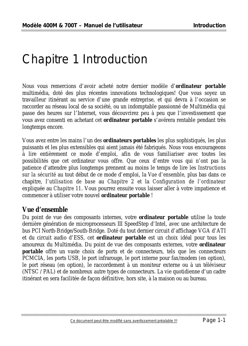 Nous vous remercions d’avoir acheté notre dernier modèle d’ordinateur portable multimédia, doté des plus récentes innovations technologiques! Que vous soyez un travailleur itinérant au service d’une grande entreprise, et qui devra à l’occasion se raccorder au réseau local de sa société, ou un indomptable passionné de Multimédia qui passe des heures sur l’Internet, vous découvrirez peu à peu que l’investissement que vous avez consenti en achetant cet ordinateur portable s’avérera rentable pendant très longtemps encore. Vous avez entre les mains l’un des ordinateurs portables les plus sophistiqués, les plus puissants et les plus extensibles qui aient jamais été fabriqués. Nous vous encourageons à lire entièrement ce mode d’emploi, afin de vous familiariser avec toutes les possibilités que cet ordinateur vous offre. Que ceux d’entre vous qui n’ont pas la patience d’attendre plus longtemps prennent au moins le temps de lire les Instructions sur la sécurité au tout début de ce mode d’emploi, la Vue d’ensemble, plus bas dans ce chapitre, l’utilisation de base au Chapitre 2 et la Configuration de l’ordinateur expliquée au Chapitre 11. Vous pourrez ensuite vous laisser aller à votre impatience et commencer à utiliser votre nouvel ordinateur portable ! Vue d’ensemble Du point de vue des composants internes, votre ordinateur portable utilise la toute dernière génération de microprocesseurs III SpeedStep d’Intel, avec une architecture de bus PCI North-Bridge/South-Bridge. Doté du tout dernier circuit d’affichage VGA d’ATI et du circuit audio d’ESS, cet ordinateur portable est un choix idéal pour tous les amoureux du Multimédia. Du point de vue des composants externes, votre ordinateur portable offre un vaste choix de ports et de connecteurs, tels que les connecteurs PCMCIA, les ports USB, le port infrarouge, le port interne pour fax/modem (en option), le port réseau (en option), le raccordement à un moniteur externe ou à un téléviseur (NTSC / PAL) et de nombreux autre types de connecteurs. La vie quotidienne d’un cadre itinérant en sera facilitée de façon définitive, hors site, à la maison ou au bureau. Ce document peut être modifié sans avertissement préalable !!! Page 1-1 Introduction Modèle 400M & 700T – Manuel de l’utilisateur Avec cet ordinateur portable, il n’a jamais été plus facile d’effectuer une mise à niveau. Vous pouvez échanger le microprocesseur en choisissant dans la gamme Pentium III d’Intel, entre 400 MHz et 700 MHz. De plus, la mémoire vive est facilement extensible de 64 Mo à 512 Mo. Le contrôleur de disque dur peut prendre en charge la plupart des disques durs IDE aux standards 9,5 mm ou 12,7 mm de l’industrie, ce qui vous assure une capacité de stockage pratiquement illimitée. L’autonomie de la batterie (ou, pour être plus précis, la durée pendant laquelle un ordinateur portable sera en mesure de fonctionner sans être raccordé au secteur) est un point important. C’est pourquoi nous avons incorporé à cet ordinateur les versions les plus récentes des interfaces APM (Advanced Power Management) et / ou ACPI (Advanced Configuration Power Interface). Nous espérons que cette présentation d’ensemble vous a permis de prendre conscience de certaines des caractéristiques les plus passionnantes de votre nouvel ordinateur, mais il reste bien des choses à dire à propos de votre ordinateur portable. Le reste de ce mode d’emploi est destiné à vous aider à obtenir le meilleur usage de votre nouvel ordinateur portable. Nous vous suggérons de lire avec attention chaque chapitre, et d’explorer chacune des fonctions qui y sont présentées. Maintenant, à vous de découvrir tout ce que votre étonnant ordinateur portable peut faire pour vous ! Page 1-2 Ce document peut être modifié sans avertissement préalable !!! Modèle 400M & 700T – Manuel de l’utilisateur Introduction