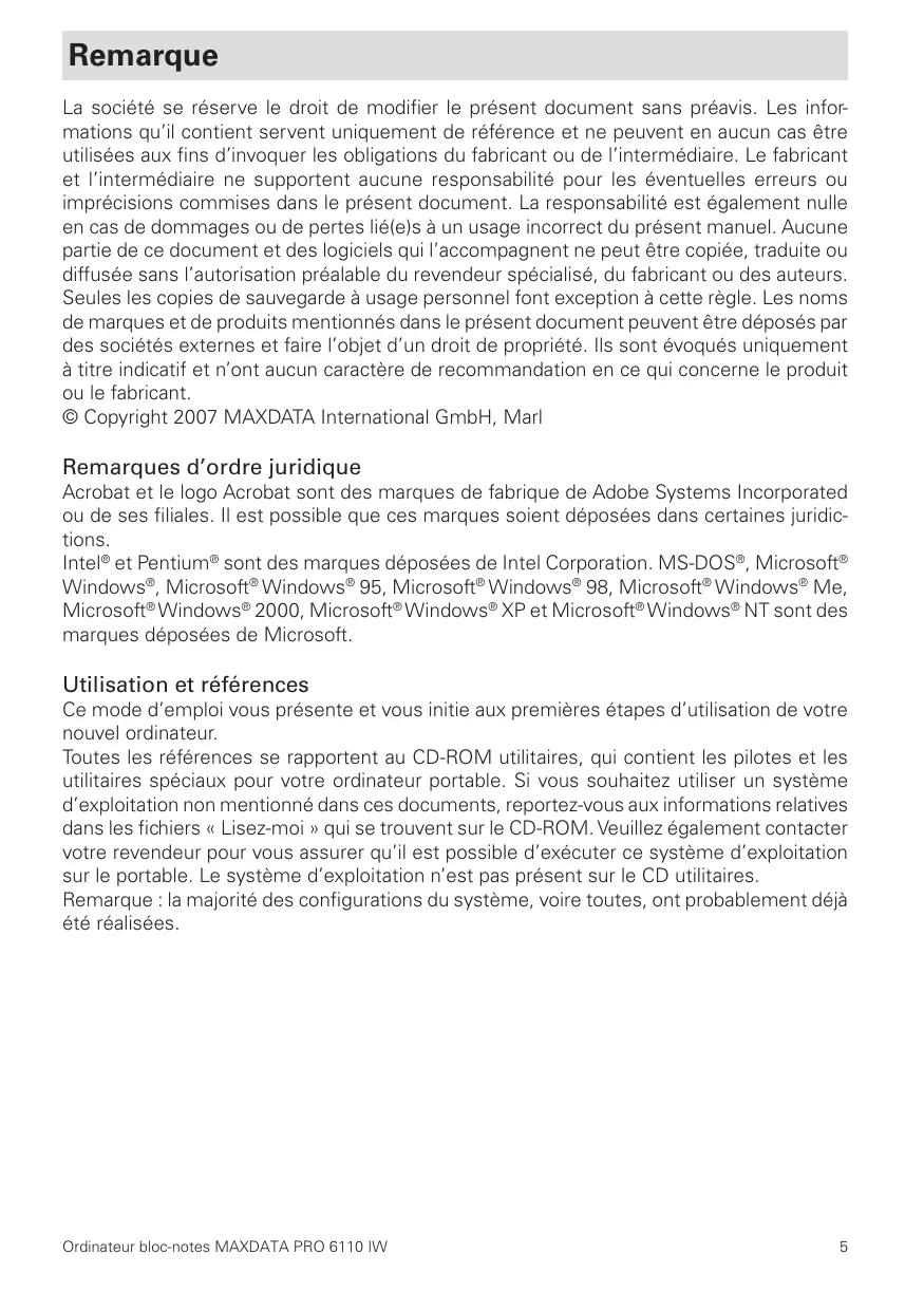 Table des matières Remarque La société se réserve le droit de modifier le présent document sans préavis. Les informations qu’il contient servent uniquement de référence et ne peuvent en aucun cas être utilisées aux fins d’invoquer les obligations du fabricant ou de l’intermédiaire. Le fabricant et l’intermédiaire ne supportent aucune responsabilité pour les éventuelles erreurs ou imprécisions commises dans le présent document. La responsabilité est également nulle en cas de dommages ou de pertes lié(e)s à un usage incorrect du présent manuel. Aucune partie de ce document et des logiciels qui l’accompagnent ne peut être copiée, traduite ou diffusée sans l’autorisation préalable du revendeur spécialisé, du fabricant ou des auteurs. Seules les copies de sauvegarde à usage personnel font exception à cette règle. Les noms de marques et de produits mentionnés dans le présent document peuvent être déposés par des sociétés externes et faire l’objet d’un droit de propriété. Ils sont évoqués uniquement à titre indicatif et n’ont aucun caractère de recommandation en ce qui concerne le produit ou le fabricant. © Copyright 2007 MAXDATA International GmbH, Marl Remarques d’ordre juridique Acrobat et le logo Acrobat sont des marques de fabrique de Adobe Systems Incorporated ou de ses filiales. Il est possible que ces marques soient déposées dans certaines juridictions. Intel® et Pentium® sont des marques déposées de Intel Corporation. MS-DOS®, Microsoft® Windows®, Microsoft® Windows® 95, Microsoft® Windows® 98, Microsoft® Windows® Me, Microsoft® Windows® 2000, Microsoft® Windows® XP et Microsoft® Windows® NT sont des marques déposées de Microsoft. Utilisation et références Ce mode d’emploi vous présente et vous initie aux premières étapes d’utilisation de votre nouvel ordinateur. Toutes les références se rapportent au CD-ROM utilitaires, qui contient les pilotes et les utilitaires spéciaux pour votre ordinateur portable. Si vous souhaitez utiliser un système d’exploitation non mentionné dans ces documents, reportez-vous aux informations relatives dans les fichiers « Lisez-moi » qui se trouvent sur le CD-ROM. Veuillez également contacter votre revendeur pour vous assurer qu’il est possible d’exécuter ce système d’exploitation sur le portable. Le système d’exploitation n’est pas présent sur le CD utilitaires. Remarque : la majorité des configurations du système, voire toutes, ont probablement déjà été réalisées. Ordinateur bloc-notes MAXDATA PRO 6110 IW