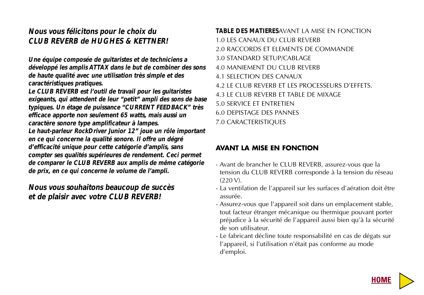 - Avant de brancher le CLUB REVERB, assurez-vous que la tension du CLUB REVERB corresponde à la tension du réseau (220 V). - La ventilation de l’appareil sur les surfaces d’aération doit être assurée. - Assurez-vous que l’appareil soit dans un emplacement stable, tout facteur étranger mécanique ou thermique pouvant porter préjudice à la sécurité de l’appareil aussi bien qu’à la sécurité de son utilisateur. - Le fabricant décline toute responsabilité en cas de dégats sur l’appareil, si l’utilisation n’était pas conforme au mode d’emploi. HOME