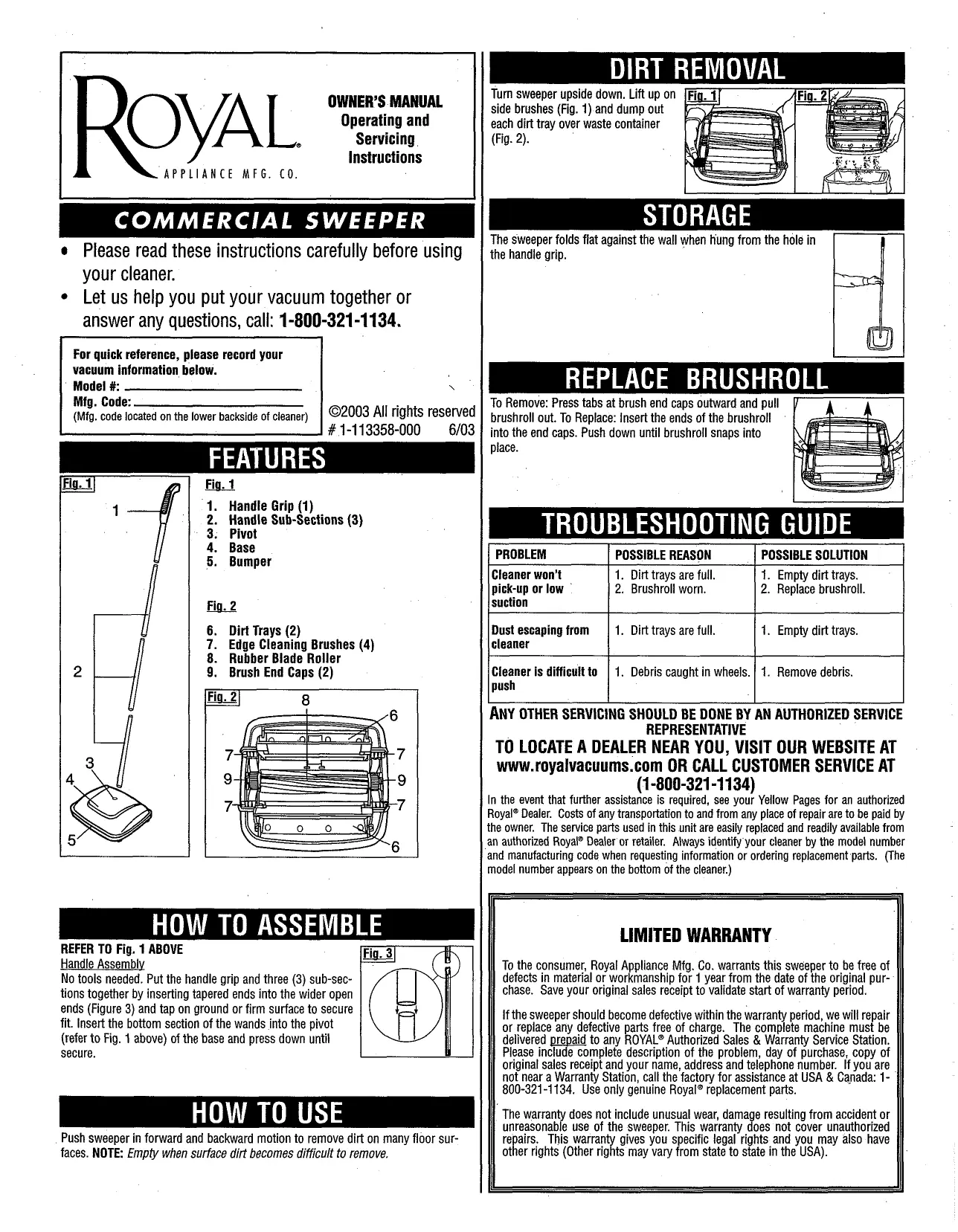 Si l'aspirateur tombe en panne pendant la période couverte par la garantie, nous réparerons ou remplacerons gratuitemment toute pièce défectueuse. L'aspirateur entier doit être retourné port payé à n'importe quel point de vente et de service sous garantie autorisé ROYAL. Veuillez inclure une description détaillée du problème, la date d'achat, une copie du reçu de vente d'origine ainsi que vos nom, adresse et numéro de téléphone. Si aucun centre de réparation ne se trouve dans votre région, communiquez avec l'usine, aux États-Unis et au Canada au 1-800-321-1134. N'utilisez que les pièces de rechange d'origine Royal.