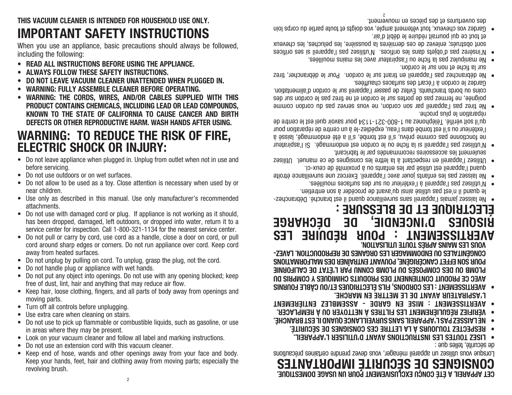 Ne laissez jamais l’appareil sans surveillance quand il est branché. Débranchezle quand il n’est pas utilisé ainsi qu’avant de procéder à son entretien. N’utilisez pas l’appareil à l’extérieur ou sur des surfaces mouillées. Ne laissez pas les enfants jouer avec l’appareil. Exercez une surveillance étroite quand l’appareil est utilisé par les enfants ou à proximité de ceux-ci. Utilisez l’appareil en respectant à la lettre les consignes de ce manuel. Utilisez seulement les accessoires recommandés par le fabricant. N’utilisez pas l’appareil si la fiche ou le cordon est endommagé. Si l’aspirateur ne fonctionne pas comme prévu, s’il est tombé, s’il a été endommagé, laissé à l’extérieur ou s’il est tombé dans l’eau, expédiez-le à un centre de réparation pour qu’il soit vérifié. Téléphonez au 1-800-321-1134 pour savoir quel est le centre de réparation le plus proche. Ne tirez pas l’appareil par son cordon, ne vous servez pas du cordon comme poignée, ne fermez pas de portes sur le cordon et ne tirez pas le cordon sur des coins ou bords tranchants. Évitez de passer l’appareil sur le cordon d’alimentation. Gardez le cordon à l’écart des surfaces chauffées. Ne débranchez pas l’appareil en tirant sur le cordon. Pour le débrancher, tirez sur la fiche et non sur le cordon. Ne manipulez pas la fiche ou l’aspirateur avec les mains mouillées. N’insérez pas d’objets dans les orifices. N’utilisez pas l’appareil si ses orifices sont obstrués; enlevez de ces dernières la poussière, les peluches, les cheveux et tout ce qui pourrait réduire le débit d’air. Gardez vos cheveux, tout vêtement ample, vos doigts et toute partie du corps loin des ouvertures et des pièces en mouvement.