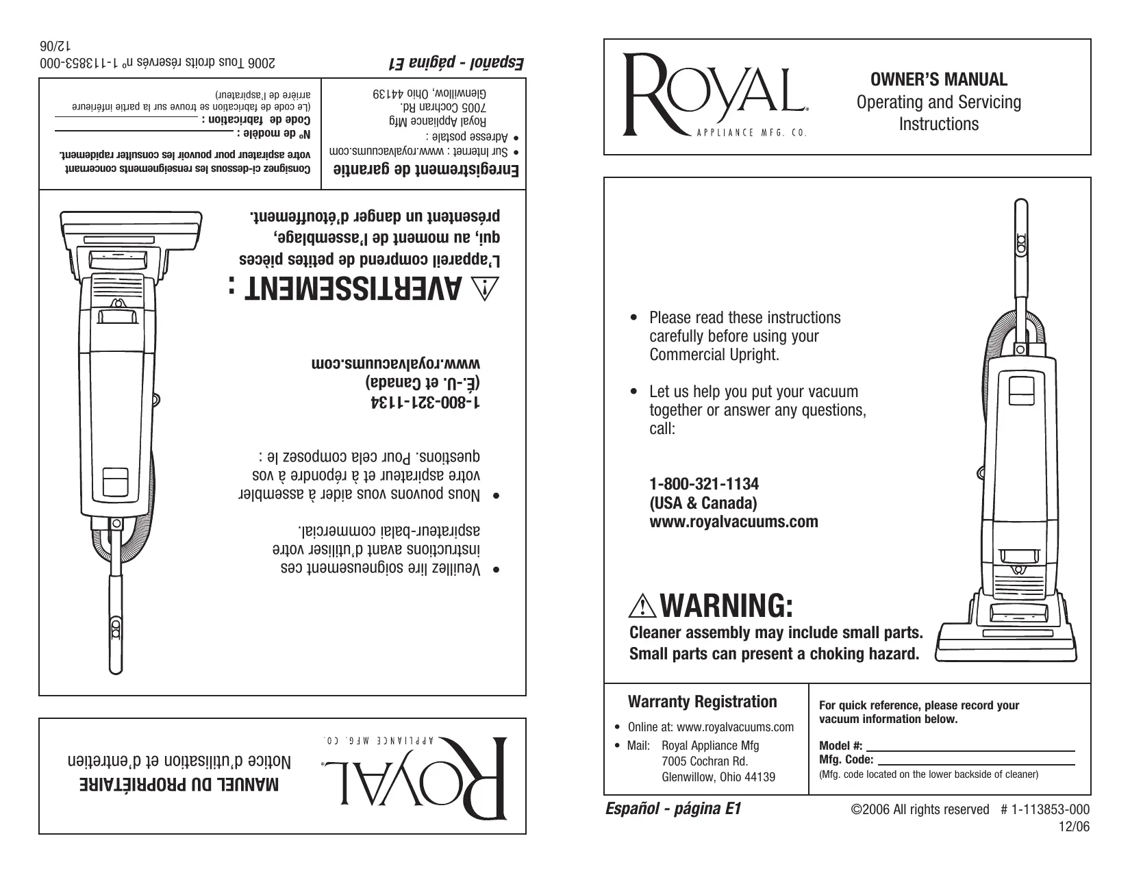 LIMITED WARRANTY Page 2, 3 Page 5 Page 6 Page 7, 8 Page 9 Page 10 Page 11 Page 12 Royal Appliance Mfg. Co. garantit au consommateur que cet aspirateur est exempt de vice de matériau ou de fabrication à compter de sa date d’achat originale. Consultez la plaque signalétique de l’appareil pour déterminer la durée de la garantie et conservez votre reçu d’achat original pour justifier la date d’entrée en vigueur de la période de garantie. To the consumer, Royal Appliance Mfg. Co. warrants this vacuum cleaner to be free of defects in material or workmanship commencing upon the date of the original purchase. Refer to the data plate label on your vacuum cleaner for the length of warranty and save your original sales receipt to validate start of warranty period. L’appareil entier doit être envoyé port payé à n’importe quel point de vente ou de réparation sous garantie de ROYALMD. Veuillez inclure une description détaillée du problème, la date d’achat, une copie du reçu d’achat original ainsi que vos nom, adresse et numéro de téléphone. Si aucun centre de réparation ne se trouve dans votre région, communiquez avec l’usine au 1-800-321-1134, pour obtenir de l’aide au Canada et aux États Unis. N’utilisez que les pièces de rechange RoyalMD. La garantie ne couvre pas l’usure inhabituelle, les dommages causés par les accidents ou un usage abusif de l’appareil. Elle ne couvre pas non plus les brosses, les sacs, les courroies plates, les filtres et les ampoules. La garantie ne couvre pas les réparations non autorisées. La garantie vous accorde des droits précis, mais il se peut que vous ayez d’autres droits (ces derniers varient d’un État à un autre au sein des États-Unis). IMPORTANT : N’UTILISEZ QUE DES PIÈCES DE RECHANGE ROYALMD AUTHENTIQUES. REMARQUE : POUR ENREGISTRER VOTRE APPAREIL, RETOURNEZ VOTRE CARTE DE GARANTIE. VOUS POUVEZ AUSSI L’ENREGISTRER EN LIGNE, SUR LE SITE WWW.DIRTDEVIL.COM. Safety Instructions. . . . . . . . . . . . . . . . . . . . . . . . . . . . . . . . . . . . Features. . . . . . . . . . . . . . . . . . . . . . . . . . . . . . . . . . . . . . . . . . . . How to Assemble. . . . . . . . . . . . . . . . . . . . . . . . . . . . . . . . . . . . . How To Operate. . . . . . . . . . . . . . . . . . . . . . . . . . . . . . . . . . . . . . Paper Bag: Removal & Replacement . . . . . . . . . . . . . . . . . . . . . . Filter: Removal & Replacement . . . . . . . . . . . . . . . . . . . . . . . . . . Brushroll Bristles: Removal & Replacement. . . . . . . . . . . . . . . . . Troubleshooting Guide. . . . . . . . . . . . . . . . . . . . . . . . . . . . . . . . .