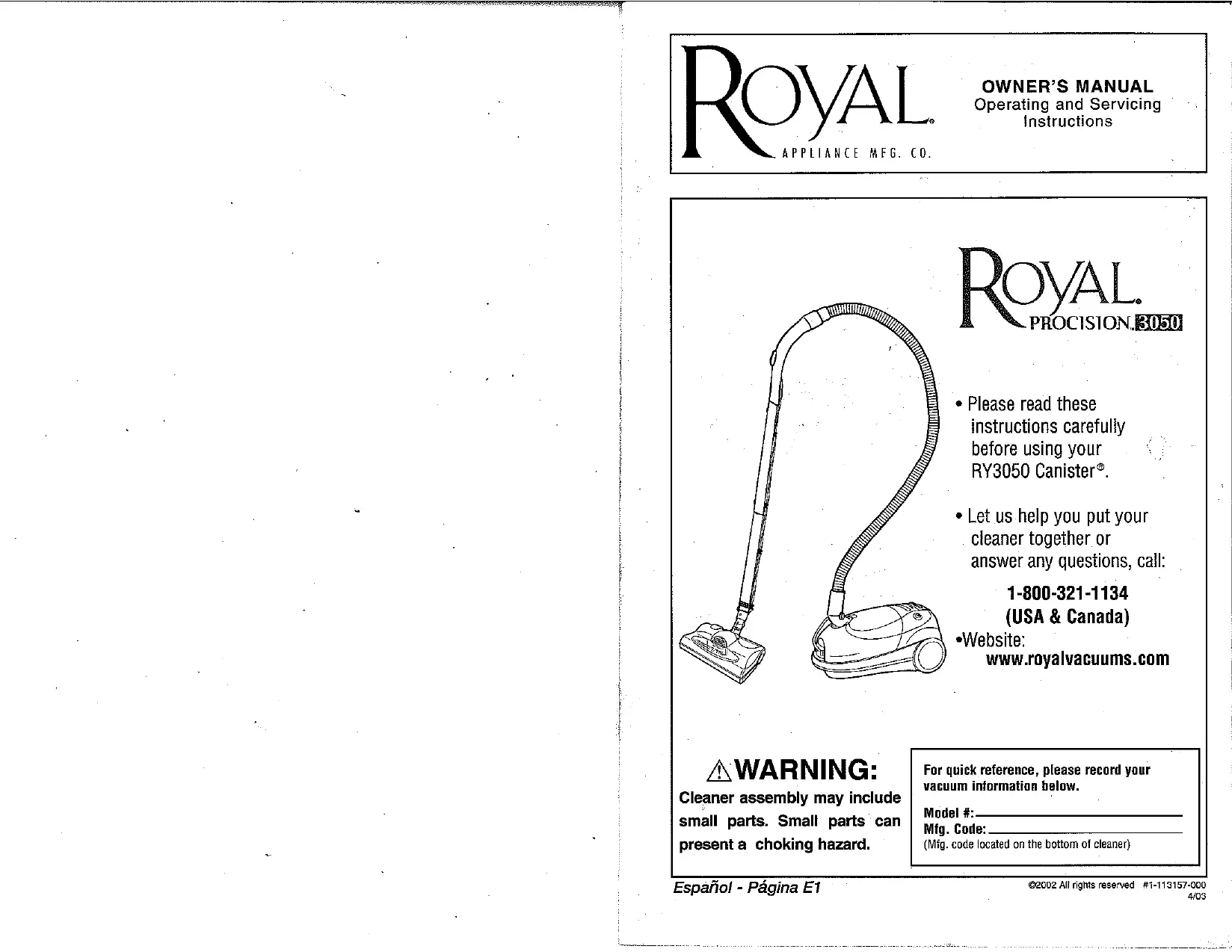 RY3050 - Aspirateur ROYAL - Notice d'utilisation et mode d'emploi gratuit