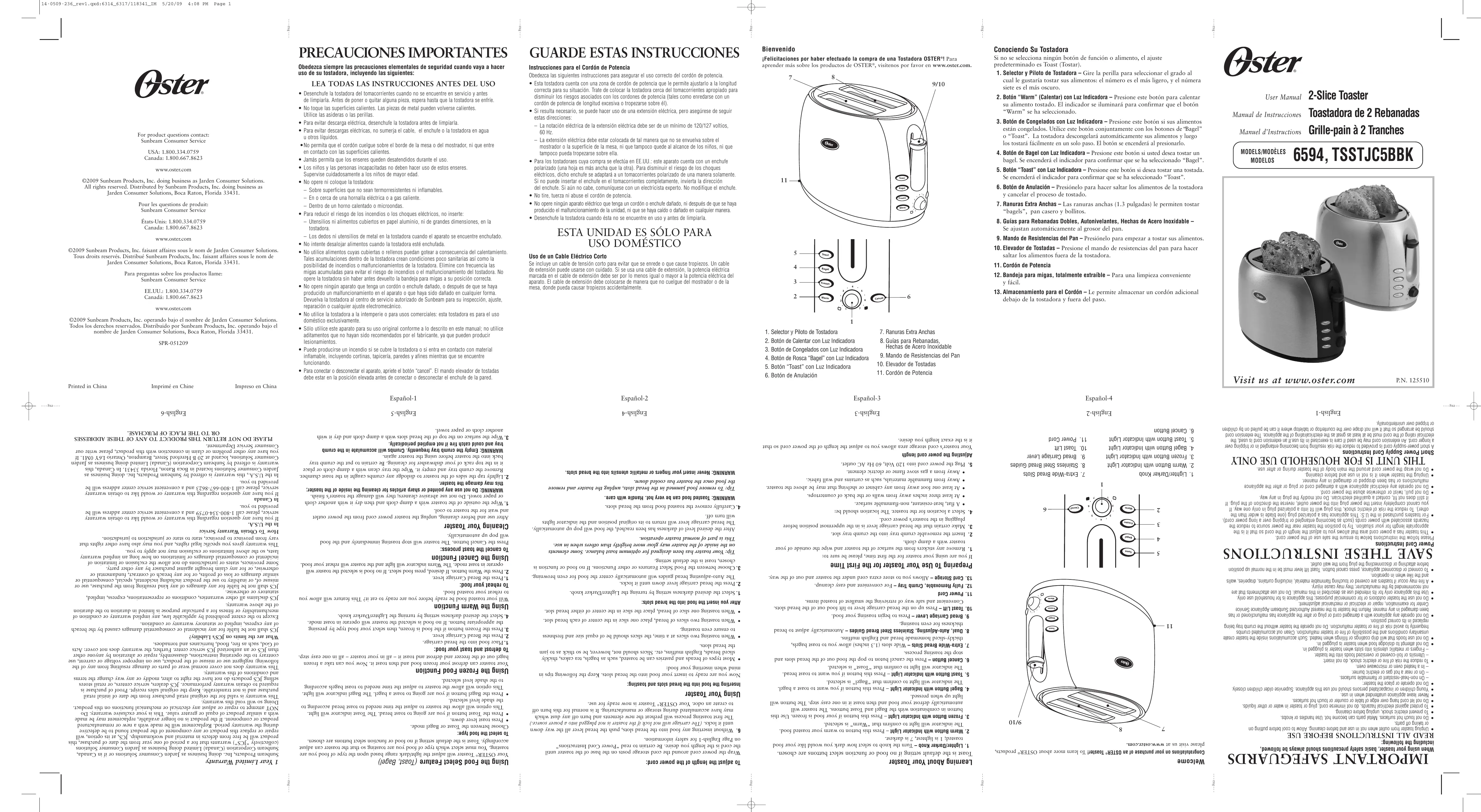 En Canadá Si tiene alguna pregunta sobre esta garantía o desea recibir servicio de garantía, llame al 1-800-667-8623 y podrá obtener la dirección del centro de servicio que le resulte más conveniente. En los Estados Unidos, esta garantía es ofrecida por Sunbeam Products, Inc. operando bajo el nombre de Jarden Consumer Solutions, Boca Ratón, Florida 33431. En Canadá, esta garantía es ofrecida por Sunbeam Corporation (Canada) Limited operando bajo el nombre de Jarden Consumer Solutions, 20 B Hereford Street, Brampton, Ontario L6Y 0M1. Si usted tiene otro problema o reclamo en conexión con este producto, por favor escriba al Departamento de Servicio al Consumidor. 2. Abaissez la manette du chariot jusqu’à ce qu’elle se bloque. Les guide-pain auto-réglables vont centrer automatiquement les aliments pour un brunissement uniforme. 3. Choisissez entre les diverses options d’aliments ou d’autres fonctions. Si aucun aliment ou fonction n’est choisi, Toast (Grille-pain) est le réglage par défaut. Truc : OSTER® a conçu ce Grille-pain pour qu’il fournisse le grillage optimal. Il est possible – et normal – que certaines parties des éléments rougeoient plus vivement que d’autres au cours du fonctionnement. Après que le niveau désiré de l’obscurité ait été atteint, la nourriture sautera vers le haut automatiquement. Le levier de chariot de pain reviendra à son position originale et les voyants de signalisation s’éteindront. 4. Retirez prudemment les tranches des fentes. AVERTISSEMENT : Les aliments juste grillés sont très chauds. Agissez avec prudence. Truc : Si un aliment se coince dans une fente, débranchez et laissez refroidir le Grille-pain avant de retirer l’aliment. AVERTISSEMENT : Ne mettez jamais vos doigts ou des ustensiles métalliques dans les fentes.