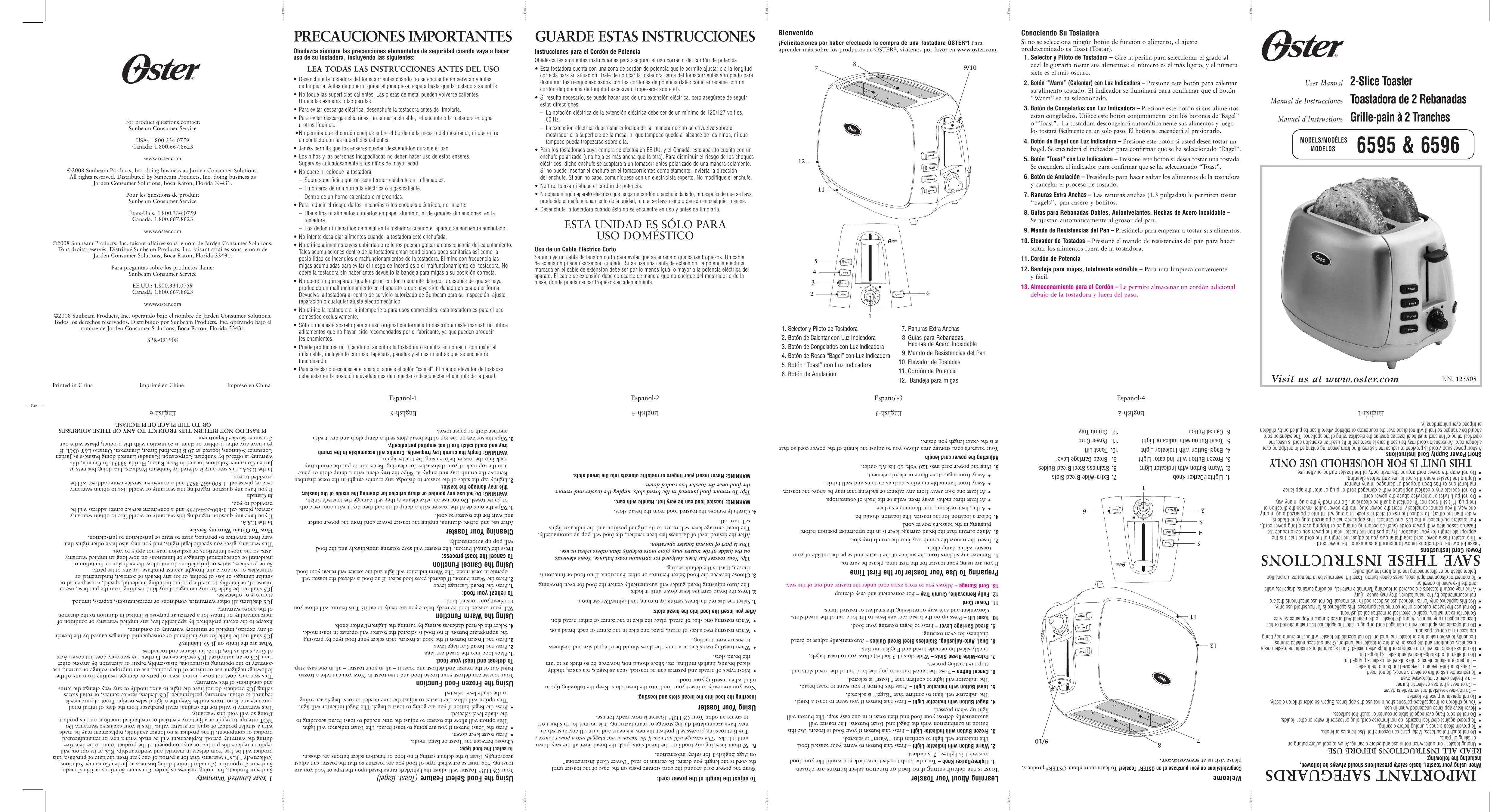 En Canadá Si tiene alguna pregunta sobre esta garantía o desea recibir servicio de garantía, llame al 1-800-667-8623 y podrá obtener la dirección del centro de servicio que le resulte más conveniente. En los Estados Unidos, esta garantía es ofrecida por Sunbeam Products, Inc. operando bajo el nombre de Jarden Consumer Solutions, Boca Ratón, Florida 33431. En Canadá, esta garantía es ofrecida por Sunbeam Corporation (Canada) Limited operando bajo el nombre de Jarden Consumer Solutions, 20 B Hereford Street, Brampton, Ontario L6Y 0M1. Si usted tiene otro problema o reclamo en conexión con este producto, por favor escriba al Departamento de Servicio al Consumidor. 2. Abaissez la manette du chariot jusqu’à ce qu’elle se bloque. Les guide-pain auto-réglables vont centrer automatiquement les aliments pour un brunissement uniforme. 3. Choisissez entre les diverses options d’aliments ou d’autres fonctions. Si aucun aliment ou fonction n’est choisi, Toast (Grille-pain) est le réglage par défaut. Truc : OSTER® a conçu ce Grille-pain pour qu’il fournisse le grillage optimal. Il est possible – et normal – que certaines parties des éléments rougeoient plus vivement que d’autres au cours du fonctionnement. Après que le niveau désiré de l’obscurité ait été atteint, la nourriture sautera vers le haut automatiquement. Le levier de chariot de pain reviendra à son position originale et les voyants de signalisation s’éteindront. 4. Retirez prudemment les tranches des fentes. AVERTISSEMENT : Les aliments juste grillés sont très chauds. Agissez avec prudence. Truc : Si un aliment se coince dans une fente, débranchez et laissez refroidir le Grille-pain avant de retirer l’aliment. AVERTISSEMENT : Ne mettez jamais vos doigts ou des ustensiles métalliques dans les fentes.