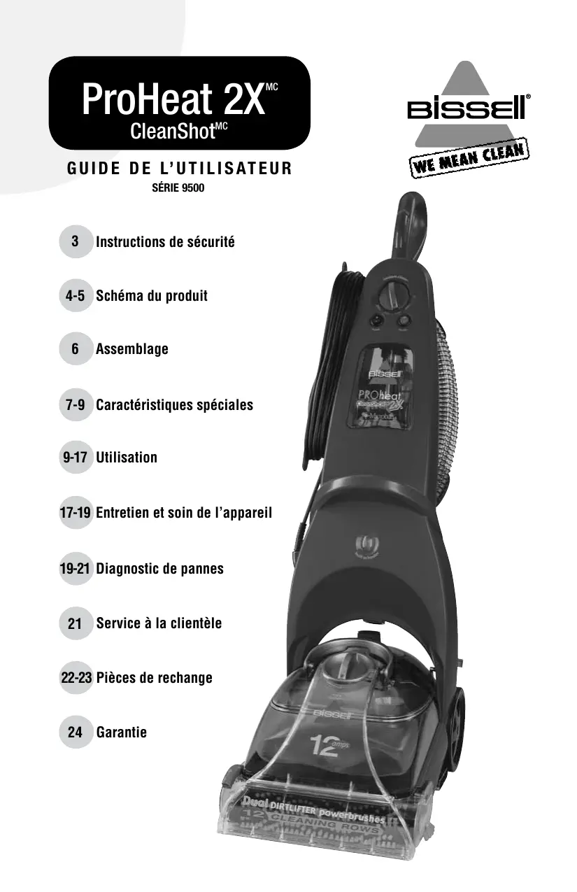 Assemblage 7-9 Caractéristiques spéciales 9-17 Utilisation 17-19 Entretien et soin de l’appareil 19-21 Diagnostic de pannes 21 Service à la clientèle 22-23 Pièces de rechange 24 Garantie Merci d’avoir acheté un appareil ProHeat 2X CleanShot de BISSELL Nous sommes heureux que vous ayez acheté un appareil de nettoyage en profondeur à produit de nettoyage chauffé ProHeat 2X de BISSELL. Toutes nos connaissances en matière d’entretien et de nettoyage de planchers ont été mises à profit au cours de la conception et de la fabrication de ce système de nettoyage domestique complet et d’avant-garde. Votre appareil ProHeat 2X est fabriqué avec beaucoup d’attention, c’est pourquoi nous l’offrons avec une garantie de un an. Nous sommes aussi soutenus par un Service à la clientèle bien informé et dévoué qui saura vous répondre avec empressement et courtoisie. Mon arrière-grand-père a inventé le balai mécanique en 1876. Aujourd’hui, BISSELL est un chef de file mondial en matière de conception, de fabrication et de service de produits d’entretien ménager de qualité supérieure, comme votre ProHeat 2X. Merci encore, de la part de tous les employés de BISSELL. Mark J. Bissell Président et chef de l’exploitationh