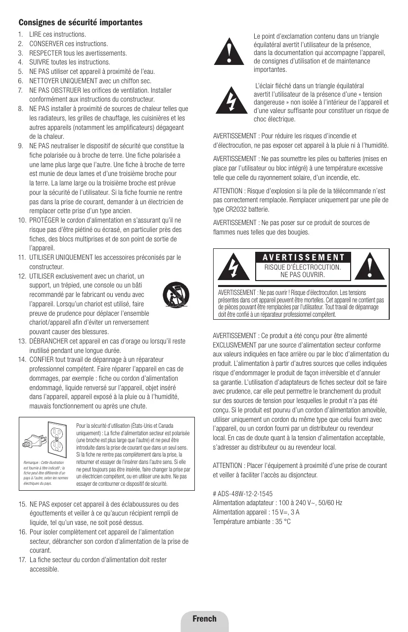 Pour la sécurité d'utilisation (États-Unis et Canada uniquement): La fiche d'alimentation secteur est polarisée (une broche est plus large que l'autre) et ne peut être introduite dans la prise de courant que dans un seul sens. Si la fiche ne rente pas complètement dans la prise, la returner et essayer de l'inserer dans l'autre sens. Si elle ne peut toujours pas'être insérée, faire changer la prise par un électricien compétent, ou en utilisant une autre. Ne pas essayer de contourner ce dispositif de sécurité.