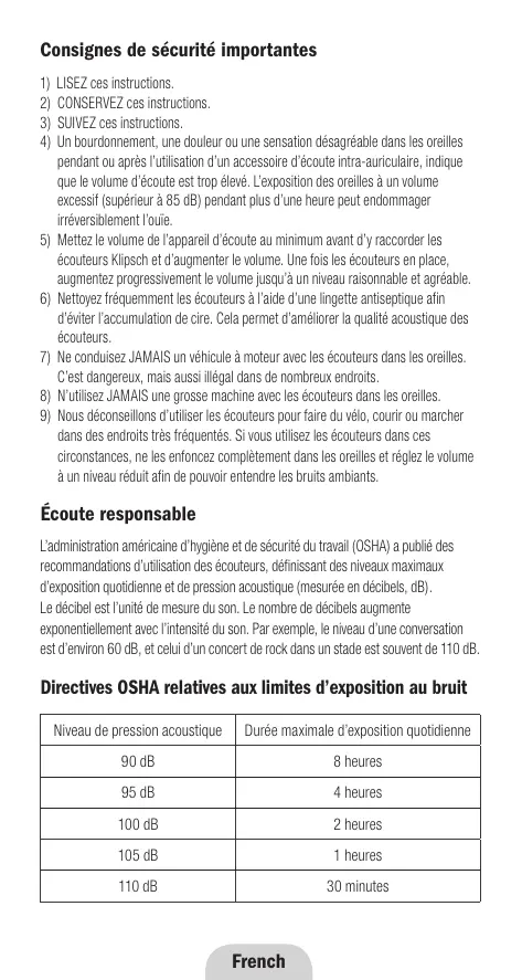 1) LISEZ ces instructions. 2) CONSERVEZ ces instructions. 3) SUIVEZ ces instructions. 4) Un bourdonnement, une douleur ou une sensation désagréable dans les oreilles pendant ou après l'utilisation d'un accessoire d'écoute intra-auriculaire, indique que le volume d'écoute est trop élevé. L'exposition des oreilles à un volume excessif (supérieur à 85 dB) pendant plus d'une heure peut endommager irréversiblement l'ouïe. 5) Mettez le volume de l'appareil d'écoute au minimum avant de y raccorder les écouteurs Klipsch et d'augmenter le volume. Une fois les écouteurs en place, augmentez progressivement le volume jusqu'à un niveau raisonnable et agréable. 6) Nettoyez fréquemment les écouteurs à l'aide d'une lingette antiseptique afin d'éviter l'accumulation de cire. Cela permet d'améliorer la qualité acoustique des écouteurs. 7) Ne conduisez JAMAIS un véhicule à moteur avec les écouteurs dans les oreilles. C'est dangereux, mais aussi illégal dans de nombreux endroits. 8) N'utilisez JAMAIS une grosse machine avec les écouteurs dans les oreilles. 9) Nous déconseillons d'utiliser les écouteurs pour faire du vélo, courir ou marcher dans des endroits très fréquentés. Si vous utilisez les écouteurs dans ces circonstances, ne les enfoncez complètement dans les oreilles et réglez le volume à un niveau réduit afin de pouvoir entendre les bruits ambiants.