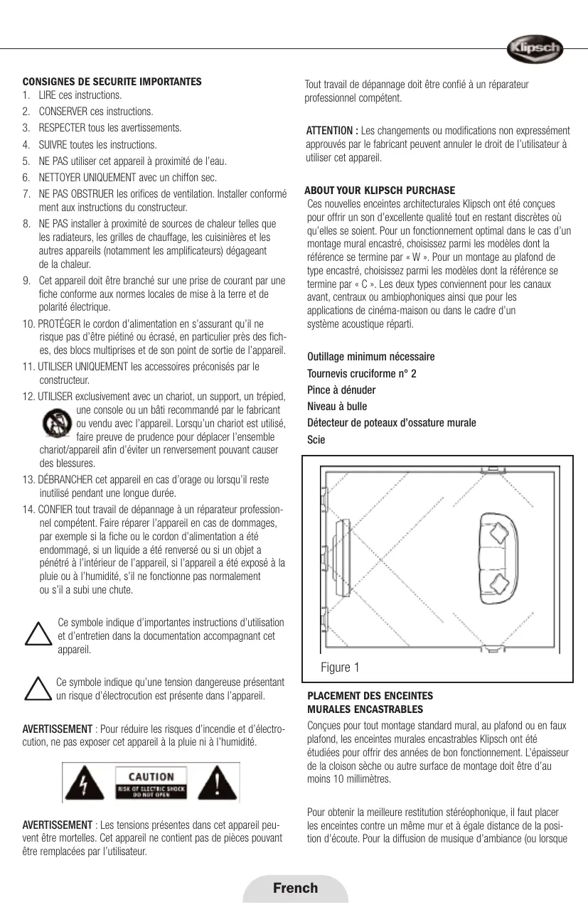 Conçues pour tout montage standard au plafond ou en faux plafond, les enceintes de plafond encastrables Klipsch ont été étudiées pour offrir des années de bon fonctionnement. L'épaisseur de la cloison sèche ou autre surface de montage doit être d'au moins 10 millimètres. Dans le cas d'une installation en faux plafond, les dalles standard de 2^ × 4^ (61 x 122 cm) et de 2^ × 2^ (60 x 60 cm) sont constituées de matérielux de faible densité pouvant se tasser dans le temps et émettre des vibrations sonores. Pour obtenir le meilleur fonctionnement des enceintes de plafond encastrables, Klipsch recommande de remplacer le panneau de montage d'origine par du contreplaqué ou un panneau de fibre de bois de densité moyenne d'une épaisseur de 12 à 19 mm.