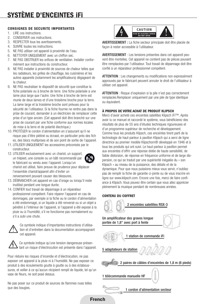 AVERTISSEMENT : Les tensions présentes dans cet appareil peuvent être mortelles. Cet appareil ne contient pas de pièces pouvant être remplacées par l’utilisateur. Tout travail de dépannage doit être confié à un réparateur professionnel compétent. ATTENTION : Les changements ou modifications non expressément approuvés par le fabricant peuvent annuler le droit de l’utilisateur à utiliser cet appareil. ATTENTION : Risque d’explosion si la pile n’est pas correctement remplacée.Remplacer uniquement par une pile de type identique ou équivalent. À PROPOS DE VOTRE ACHAT DE PRODUIT KLIPSCH Merci d’avoir acheté ces enceintes satellites Klipsch iFi™. Après avoir lu ce manuel et raccordé le système, vous bénéficierez des résultats de plus de 55 ans d’études techniques rigoureuses et d’un programme supérieur de recherche et développement. Comme tous les produits Klipsch, ces enceintes tirent parti de la technologie de haut-parleur à pavillon Klipsch qui a servi de ligne directrice au premier modèle Klipschorn® développé en 1946 et à tous les produits qui ont suivi. Le haut-parleur à pavillon permet aux enceintes d’offrir une réponse dotée de haute sensibilité, de faible distorsion, de réponse en fréquence uniforme et de large dispersion, ce qui se traduit par une supériorité inégalée du « son Klipsch » au niveau de la puissance, des détails et de la dynamique. Pour que nous puissions mieux vous servir, n’oubliez pas de remplir la fiche de garantie ci-jointe ou de vous inscrire en ligne sur www.klipsch.com. Encore une fois, merci de faire confiance à Klipsch. Vous pouvez être certain que vous allez apprécier pleinement la musique pendant de nombreuses années. CONTENU DU COFFRET 2 enceintes satellites RSX-3