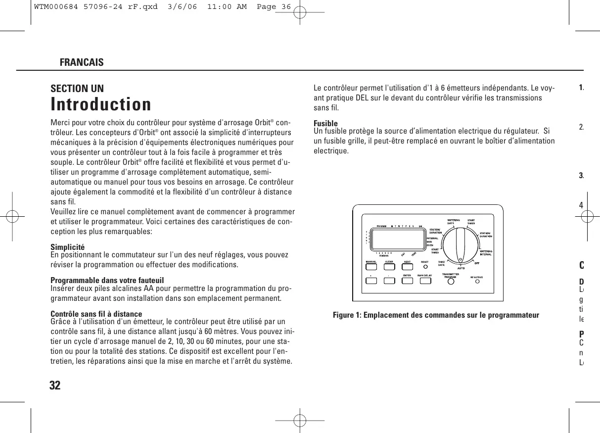Introduction Merci pour votre choix du contrôleur pour système d'arrosage Orbit® contrôleur. Les concepteurs d'Orbit® ont associé la simplicité d'interrupteurs mécaniques à la précision d'équipements électroniques numériques pour vous présenter un contrôleur tout à la fois facile à programmer et très souple. Le contrôleur Orbit® offre facilité et flexibilité et vous permet d'utiliser un programme d'arrosage complètement automatique, semiautomatique ou manuel pour tous vos besoins en arrosage. Ce contrôleur ajoute également la commodité et la flexibilité d'un contrôleur à distance sans fil. Veuillez lire ce manuel complètement avant de commencer à programmer et utiliser le programmateur. Voici certaines des caractéristiques de conception les plus remarquables: Le contrôleur permet l'utilisation d'1 à 6 émetteurs indépendants. Le voyant pratique DEL sur le devant du contrôleur vérifie les transmissions sans fil.