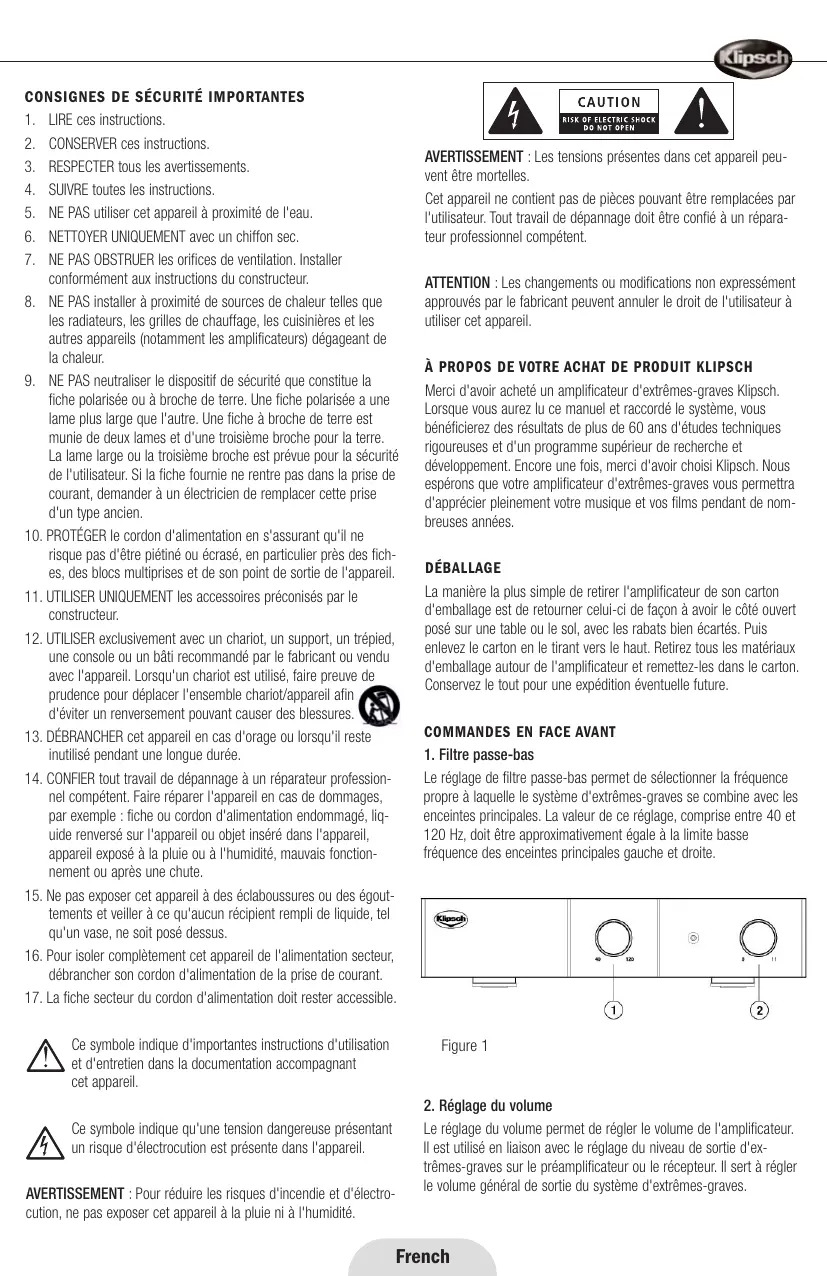 Lorsque vous aurez lu ce manuel et raccordé le système, vous bénéficierez des résultats de plus de 60 ans d'études techniques rigoureuses et d'un programme supérieur de recherche et développement. Encore une fois, merci d'avoir choisi Klipsch. Nous espérons que votre amplificateur d'extrêmes-graves vous permettra d'apprécier pleinement libre musique et vos films pendant de nombreuses années.