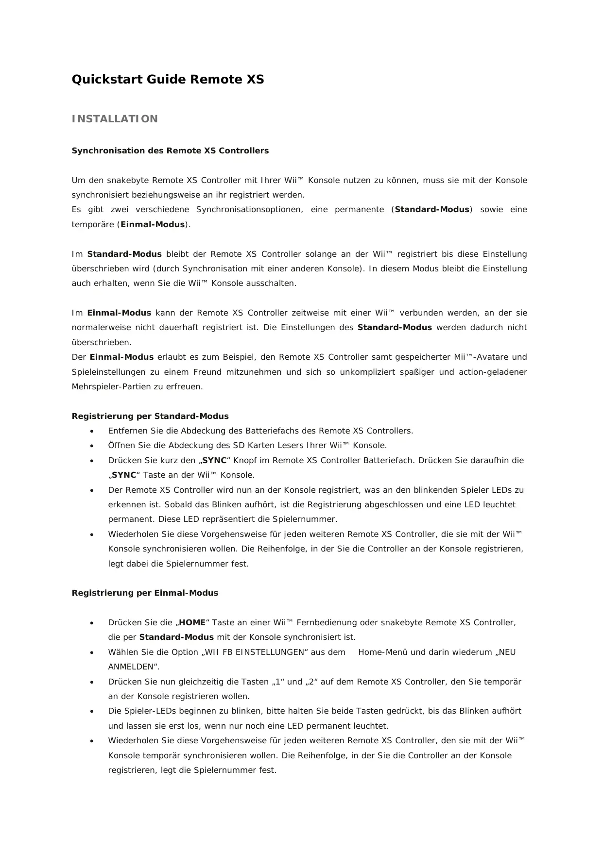 Dans un mode temporaire, la Remote XS Snakebyte peut être synchronisée provisoirement avec une console, elle n'est pas liée à la console de façon permanente. La mise en mode standard n'efface pas le mode installé précédemment. Profitez de ce mode en partageant les données stockées dans votre Remote XS comme les avatars et les paramètres de jeu de votre Wii™ à tous vos contacts.