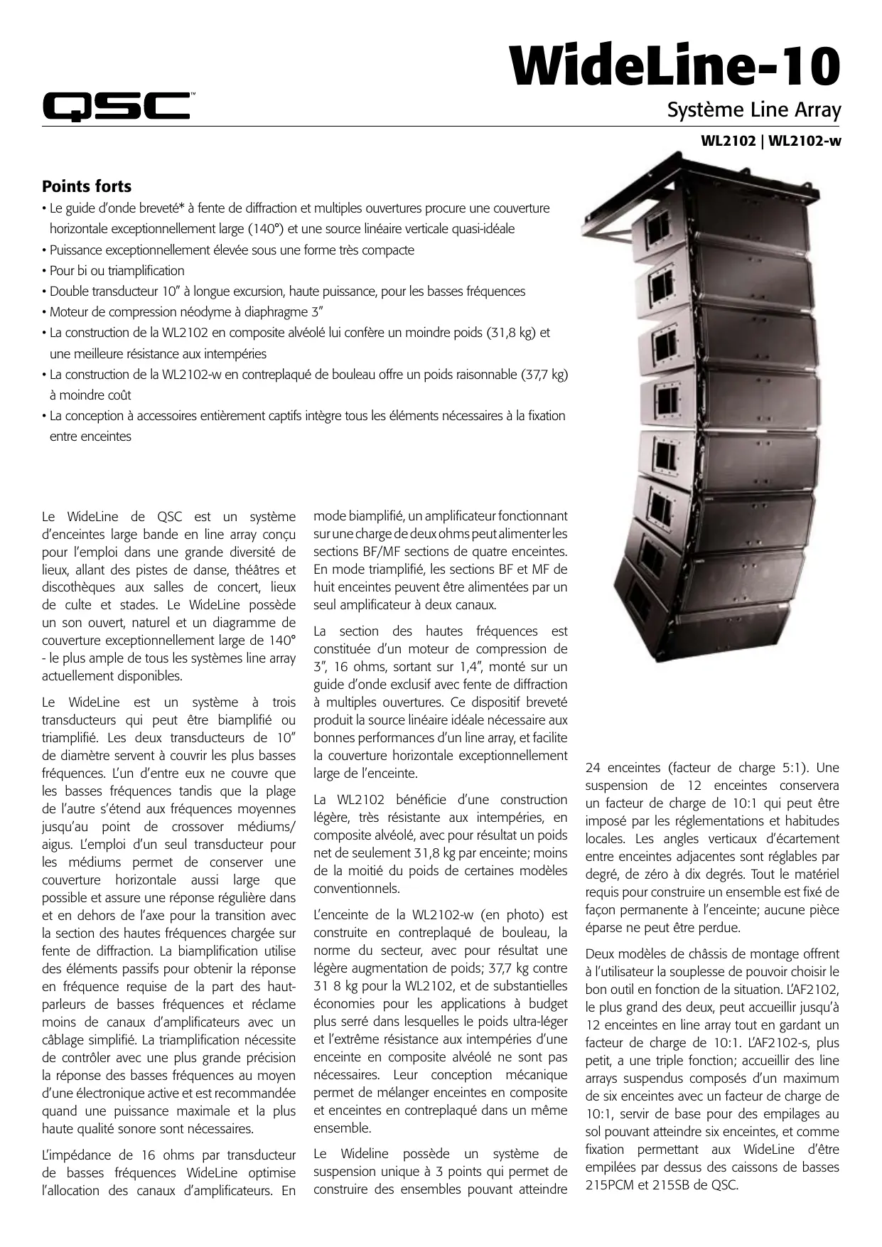 Le WideLine de QSC est un système d’enceintes large bande en line array conçu pour l’emploi dans une grande diversité de lieux, allant des pistes de danse, théâtres et discothèques aux salles de concert, lieux de culte et stades. Le WideLine possède un son ouvert, naturel et un diagramme de couverture exceptionnellement large de 140° - le plus ample de tous les systèmes line array actuellement disponibles. Le WideLine est un système à trois transducteurs qui peut être biamplifié ou triamplifié. Les deux transducteurs de 10” de diamètre servent à couvrir les plus basses fréquences. L’un d’entre eux ne couvre que les basses fréquences tandis que la plage de l’autre s’étend aux fréquences moyennes jusqu’au point de crossover médiums/ aigus. L’emploi d’un seul transducteur pour les médiums permet de conserver une couverture horizontale aussi large que possible et assure une réponse régulière dans et en dehors de l’axe pour la transition avec la section des hautes fréquences chargée sur fente de diffraction. La biamplification utilise des éléments passifs pour obtenir la réponse en fréquence requise de la part des hautparleurs de basses fréquences et réclame moins de canaux d’amplificateurs avec un câblage simplifié. La triamplification nécessite de contrôler avec une plus grande précision la réponse des basses fréquences au moyen d’une électronique active et est recommandée quand une puissance maximale et la plus haute qualité sonore sont nécessaires. L’impédance de 16 ohms par transducteur de basses fréquences WideLine optimise l’allocation des canaux d’amplificateurs. En