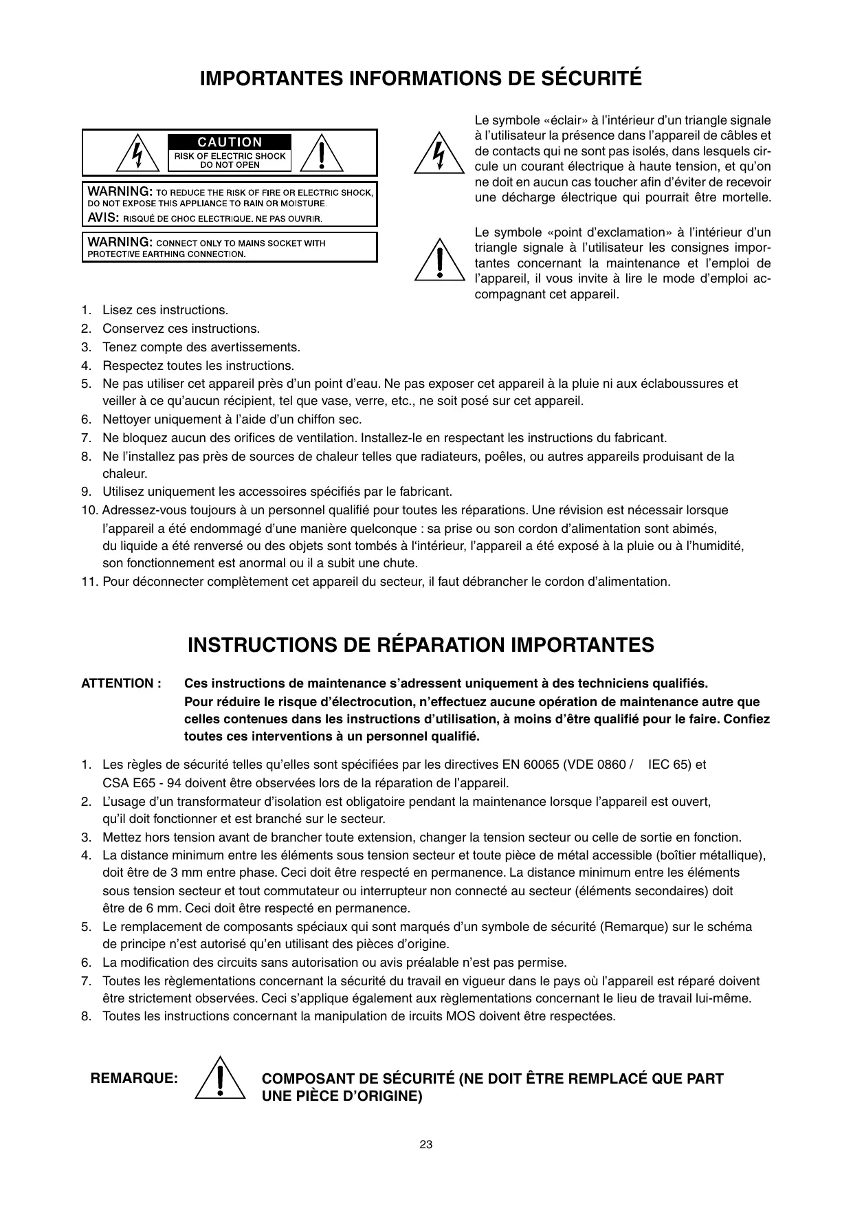 Le symbole «éclair» à l’intérieur d’un triangle signale à l’utilisateur la présence dans l’appareil de câbles et de contacts qui ne sont pas isolés, dans lesquels circule un courant électrique à haute tension, et qu’on ne doit en aucun cas toucher afin d’éviter de recevoir une décharge électrique qui pourrait être mortelle. Le symbole «point d’exclamation» à l’intérieur d’un triangle signale à l’utilisateur les consignes importantes concernant la maintenance et l’emploi de l’appareil, il vous invite à lire le mode d’emploi accompagnant cet appareil.