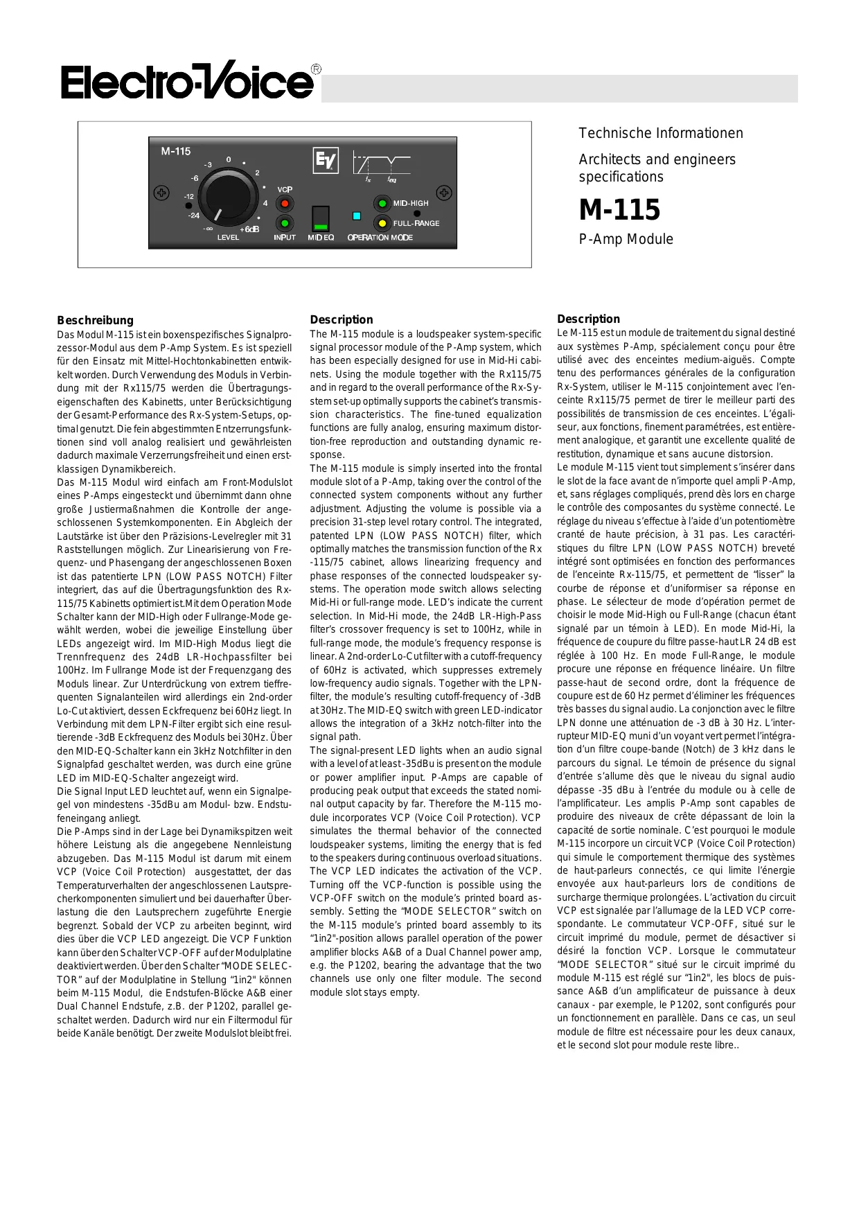 Le M-115 est un module de traitement du signal destiné aux systèmes P-Amp, spécialement conçu pour être utilisé avec des enceintes medium-aigués. Compte tenu des performances générales de la configuration Rx-System, utiliser le M-115 conjointement avec l'enceinte Rx115/75 permet de tirer le meilleur parti des possibilités de transmission de ces enceintes. L'égaliseur, aux fonctions finement paramétrées, est entièrement analogique, et garantit une excellente qualité de restitution, dynamique et sans aucune distorsion.