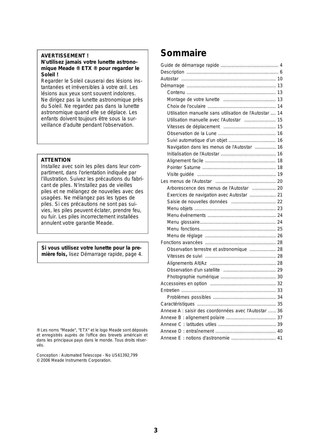 Les noms "Meade", "ETX" et le logo Meade sont déposés et enregistrés auprès de l'office des brevets américain et dans les principaux pays dans le monde. Tous droits réservés.