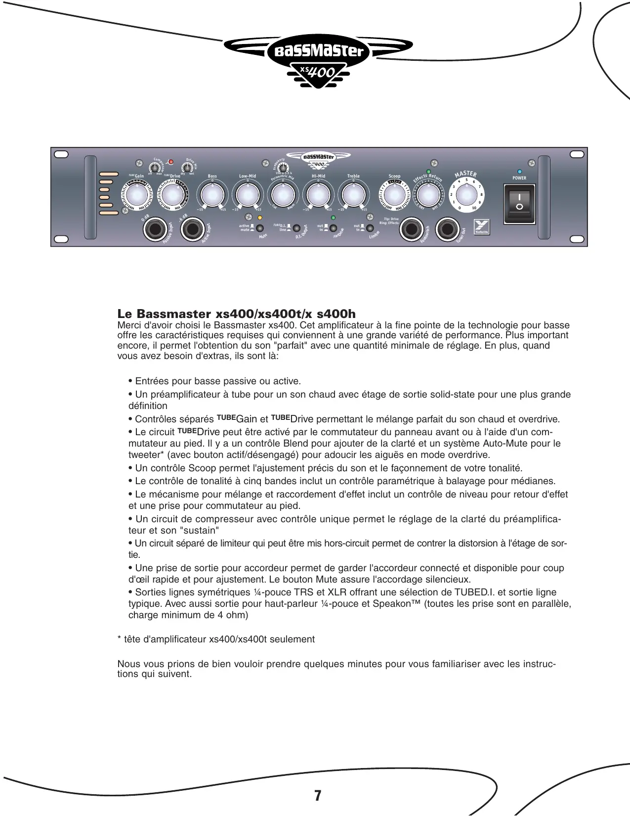 Merci d'avoir choisi le Bassmaster xs400. Cet amplificateur à la fine pointe de la technologie pour basse offre les caractéristiques requises qui conviennent à une grande variété de performances. Plus important encore, il permet l'obtention du son "parfait" avec une quantité minimale de réglage. En plus, quand vous avez besoin d'extras, ils sont là: