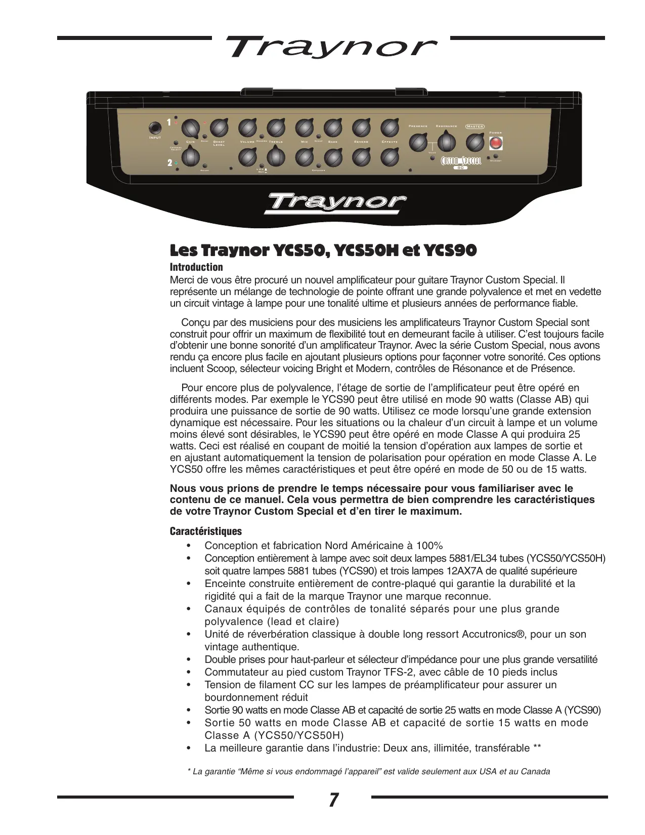 Nos you prions de prender le temps necessaire pour vous familiariser avec le contenu de ce manuel. Cela you permettra de bien comprendre les caractéristiques de votre Traynor Custom Special et d'en tirer le maximum.
