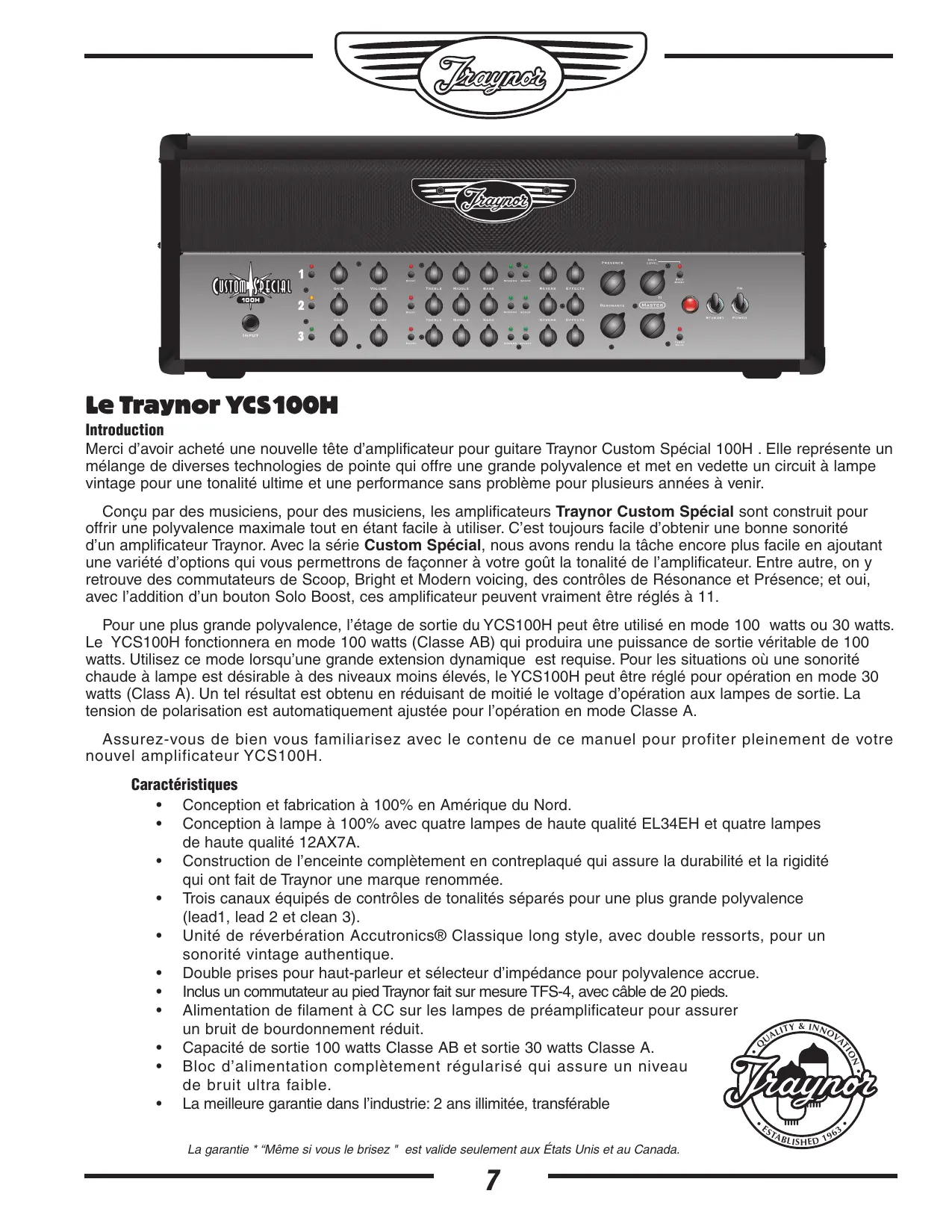 Merci d'avoir acheté une nouvelle tête d'amplificateur pour guitare Traynor Custom Special 100H. Elle représente un mélange de diverses technologies de pointe qui offre une grande polyvalence et met en vedette un circuit à lampe vintage pour une tonalité ultime et une performance sans problème pour plusieurs années à partir.