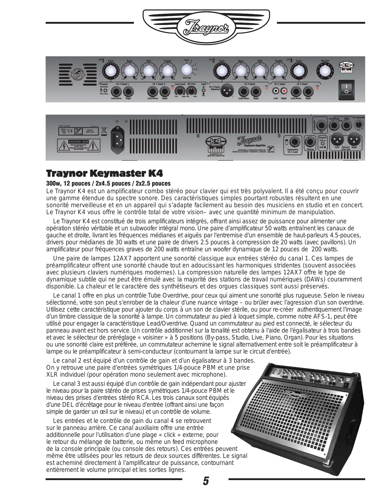 Le Traynor K4 est un amplificateur combo stéreo pour clavier qui est très polyvalent. Il a été conçu pour couvrir une gamme étendue du spectre sonore. Des caractéristiques simples pourtant robustes résultat en une sonorité merveilleuse et en un appeareil qui s'adapte facilement au besoin des musiciens en studio et en concert. Le Traynor K4 vous offre le contrôle total de votre vision- avec une quantité minimum de manipulation.