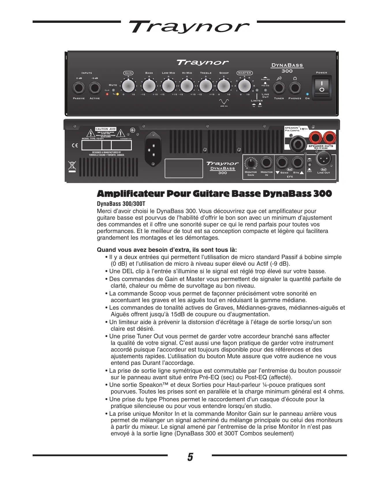 External Speaker Phones BLOCK-DIAG-dynabass300-dynabass300t-dynabass300h-00-1v1 Traynor Two Year Warranty Unlimited Warranty Your Traynor two year unlimited warranty on this product is transferable and does not require registration with Yorkville Sound or your dealer. If this product should fail for any reason within two years of the original purchase date, simply return it to your Traynor dealer with original proof of purchase and it will be repaired free of charge. Freight charges, consequential damages, weather damage, damage as a result of improper installation, damages due to exposure to extreme humidity, accident or natural disaster are excluded under the terms of this warranty. Warranty does not cover consumables such as vacuum tubes, bulbs or batteries beyond 90 days of original purchase. See your Yorkville dealer for more details. Warranty valid only in Canada and the United States. Garantie Illimitée La garantie illimitée de deux ans de ce produit est transférable. Il n`est pas nécessaire de faire enregistrer votre nom auprès de Yorkville Sound ou de votre détaillant. Si, pour une raison quelconque, ce produit devient défectueux durant les deux années qui suivent la date d`achat initial, retournez-le simplement à votre détaillant Traynor avec la preuve d`achat original et il sera réparé gratuitement. Les frais de port et de manutention ainsi que les dommages indirects ou dommages causés par désastres naturels, extrême humidité ou mauvaise installation ne sont pas couverts par cette garantie. Cette garantie ne couvre pas les produits consommables tels que lampes ou les piles. Les produits consommables ne sont garantie que pour 90 jours suivant la date d'achat. Voir votre détaillant Yorkville pour plus de détails. Cette garantie n’est valide qu’au Canada et aux États Unis d’Amérique. Canada U.S.A. Voice: (905) 837-8481 Voice: (716) 297-2920 Fax: (905) 837-8746 Fax: (716) 297-3689 w w w . y o r k v i l l e . c o m Yorkville Sound 550 Granite Court Pickering, Ontario