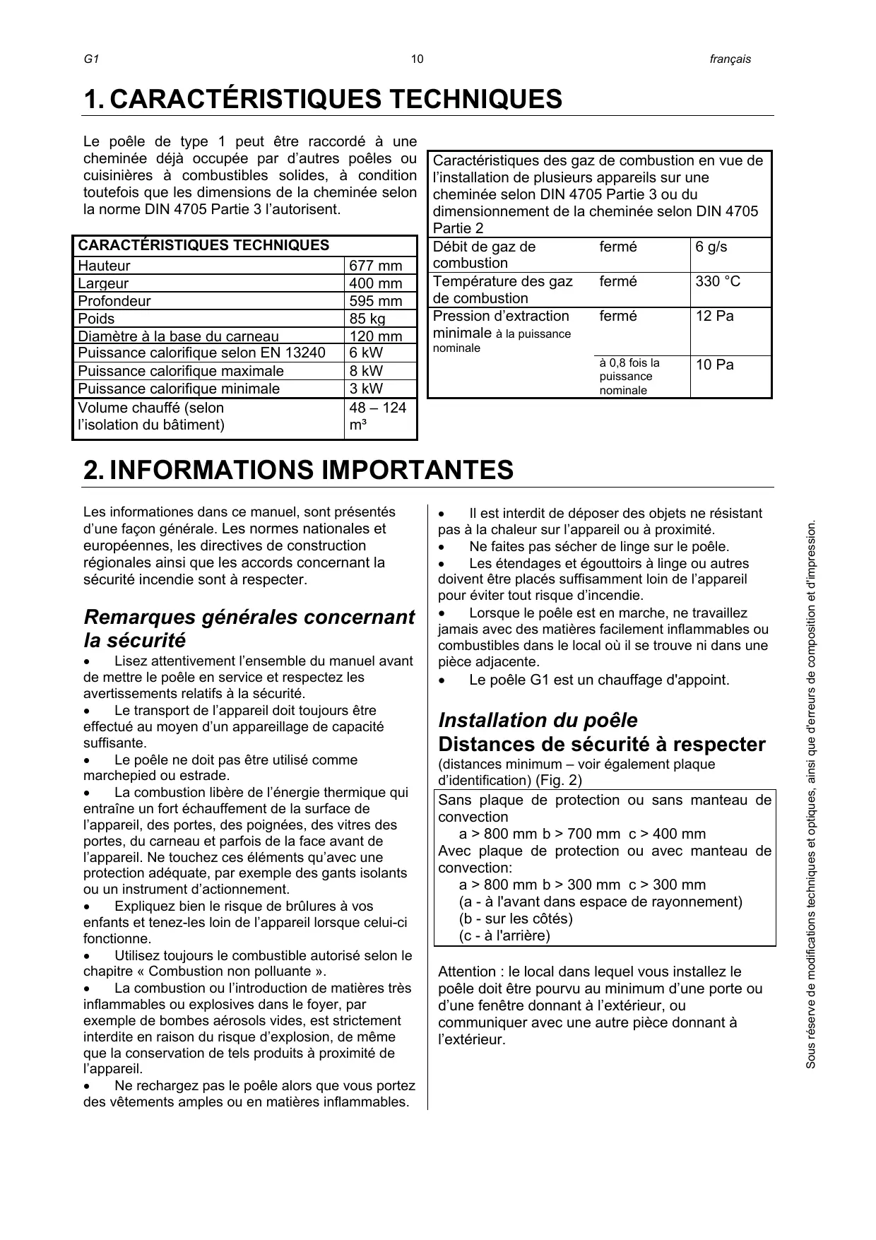 Le poêle G1 est un chauffage d'appoint. Installation du poêle Distances de sécurité à respecter (distances minimum – voir également plaque d’identification) (Fig. 2) Sans plaque de protection ou sans manteau de convection a > 800 mm b > 700 mm c > 400 mm Avec plaque de protection ou avec manteau de convection: a > 800 mm b > 300 mm c > 300 mm (a - à l'avant dans espace de rayonnement) (b - sur les côtés) (c - à l'arrière) Attention : le local dans lequel vous installez le poêle doit être pourvu au minimum d’une porte ou d’une fenêtre donnant à l’extérieur, ou communiquer avec une autre pièce donnant à l’extérieur. Sous réserve de modifications techniques et optiques, ainsi que d'erreurs de composition et d'impression.