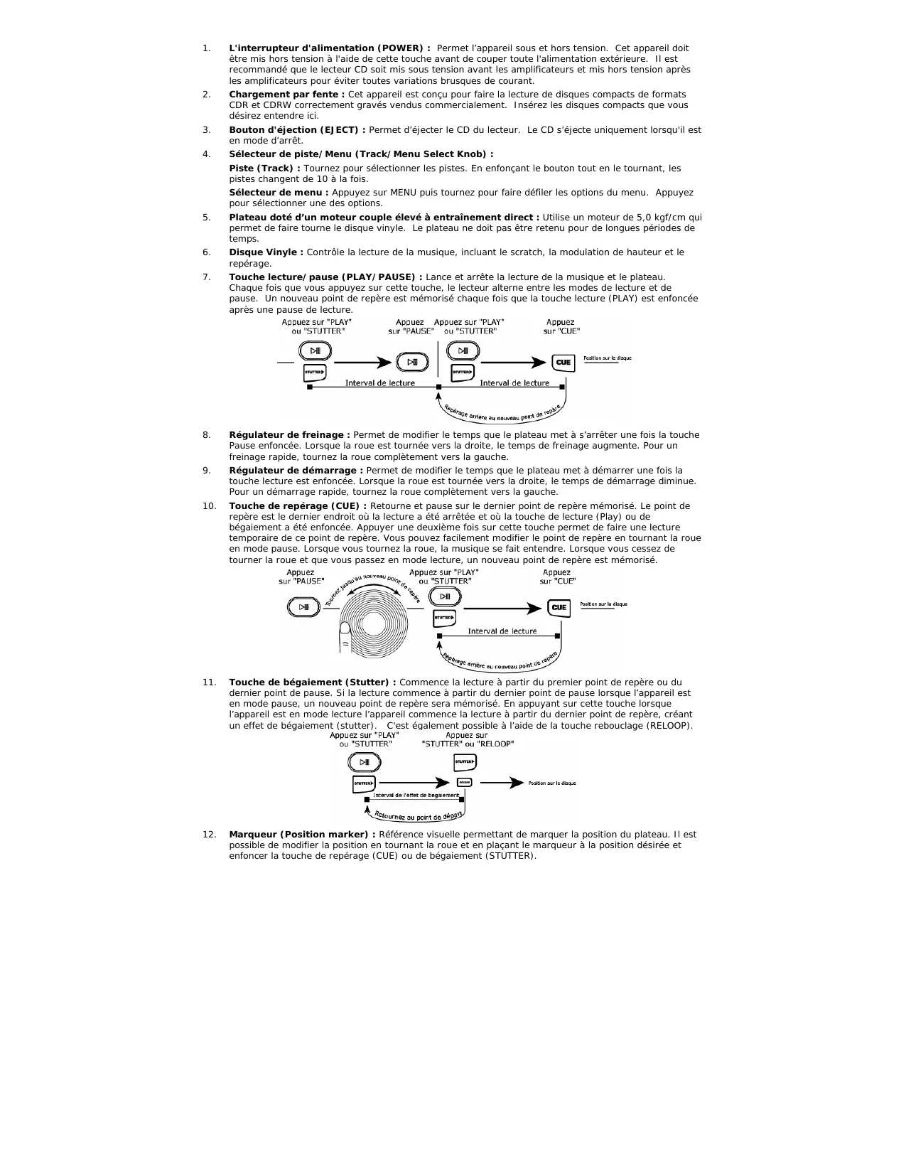 Touche de repérage (CUE) : Retourne et pause sur le dernier point de repère mémorisé. Le point de repère est le dernier endroit où la lecture a été arrêtée et où la touche de lecture (Play) ou de bégaiement a été enfoncée. Appuyer une deuxième fois sur cette touche permet de faire une lecture temporaire de ce point de repère. Vous pouvez facilement modifier le point de repère en tournant la roue en mode pause. Lorsque vous tournez la roue, la musique se fait entendre. Lorsque vous cessez de tourner la roue et que vous passez en mode lecture, un nouveau point de repère est mémorisé.
