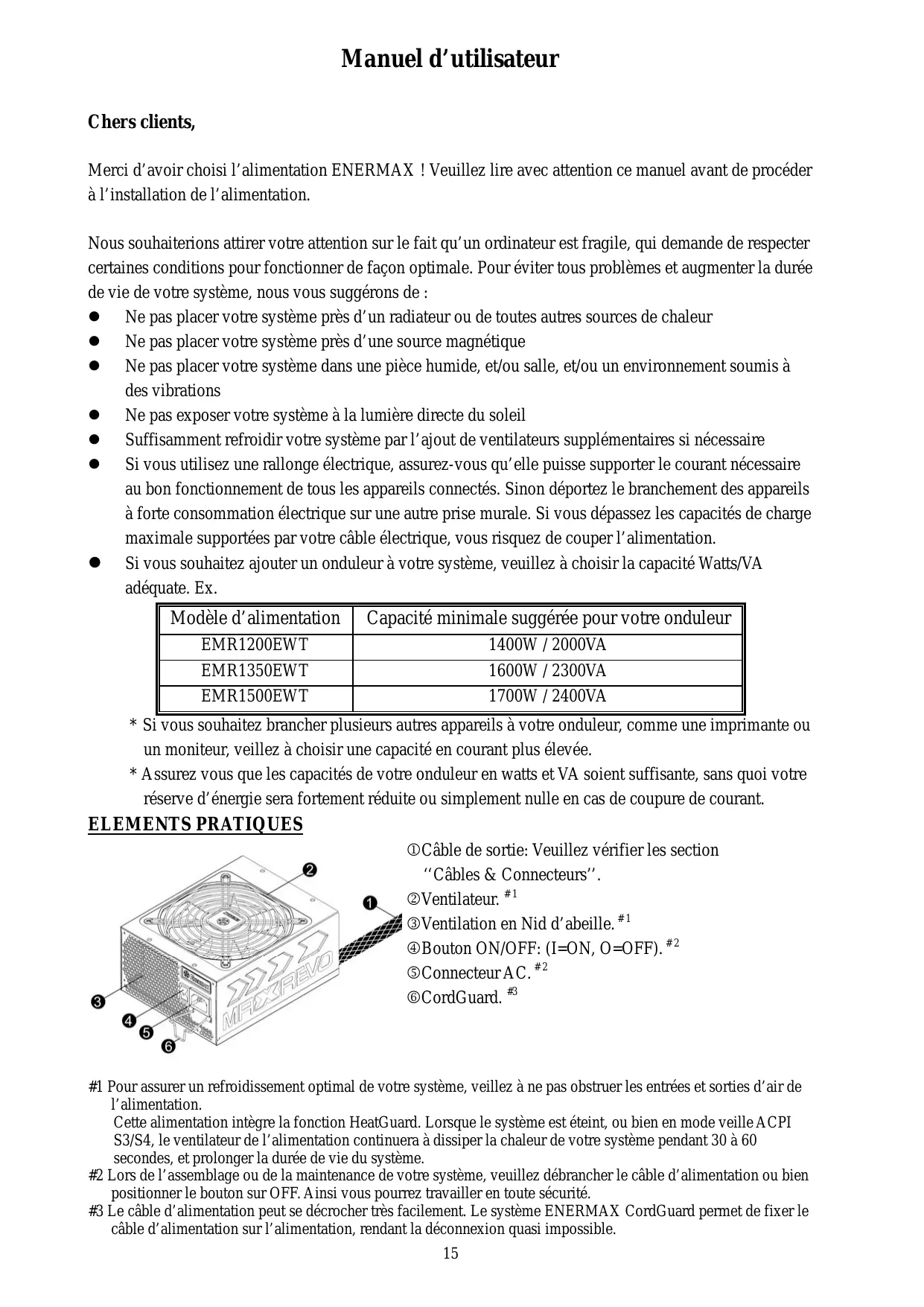 Manuel d’utilisateur Chers clients, Merci d’avoir choisi l’alimentation ENERMAX ! Veuillez lire avec attention ce manuel avant de procéder à l’installation de l’alimentation. Nous souhaiterions attirer votre attention sur le fait qu’un ordinateur est fragile, qui demande de respecter certaines conditions pour fonctionner de façon optimale. Pour éviter tous problèmes et augmenter la durée de vie de votre système, nous vous suggérons de : Ne pas placer votre système près d’un radiateur ou de toutes autres sources de chaleur Ne pas placer votre système près d’une source magnétique Ne pas placer votre système dans une pièce humide, et/ou salle, et/ou un environnement soumis à des vibrations Ne pas exposer votre système à la lumière directe du soleil Suffisamment refroidir votre système par l’ajout de ventilateurs supplémentaires si nécessaire Si vous utilisez une rallonge électrique, assurez-vous qu’elle puisse supporter le courant nécessaire au bon fonctionnement de tous les appareils connectés. Sinon déportez le branchement des appareils à forte consommation électrique sur une autre prise murale. Si vous dépassez les capacités de charge maximale supportées par votre câble électrique, vous risquez de couper l’alimentation. Si vous souhaitez ajouter un onduleur à votre système, veuillez à choisir la capacité Watts/VA adéquate. Ex.