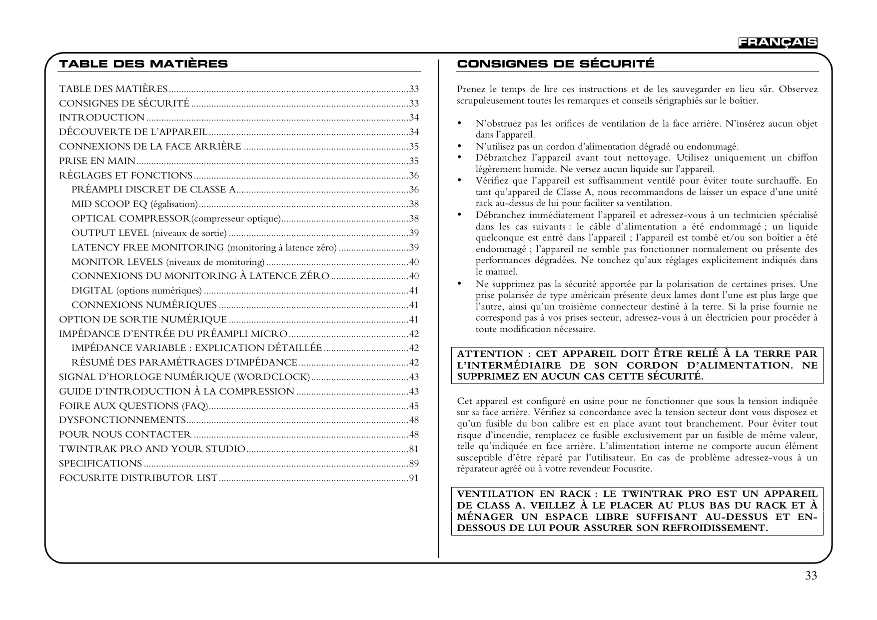 N’obstruez pas les orifices de ventilation de la face arrière. N’insérez aucun objet dans l’appareil. N’utilisez pas un cordon d’alimentation dégradé ou endommagé. Débranchez l’appareil avant tout nettoyage. Utilisez uniquement un chiffon légèrement humide. Ne versez aucun liquide sur l’appareil. Vérifiez que l’appareil est suffisamment ventilé pour éviter toute surchauffe. En tant qu’appareil de Classe A, nous recommandons de laisser un espace d’une unité rack au-dessus de lui pour faciliter sa ventilation. Débranchez immédiatement l’appareil et adressez-vous à un technicien spécialisé dans les cas suivants : le câble d’alimentation a été endommagé ; un liquide quelconque est entré dans l’appareil ; l’appareil est tombé et/ou son boîtier a été endommagé ; l’appareil ne semble pas fonctionner normalement ou présente des performances dégradées. Ne touchez qu’aux réglages explicitement indiqués dans le manuel. Ne supprimez pas la sécurité apportée par la polarisation de certaines prises. Une prise polarisée de type américain présente deux lames dont l’une est plus large que l’autre, ainsi qu’un troisième connecteur destiné à la terre. Si la prise fournie ne correspond pas à vos prises secteur, adressez-vous à un électricien pour procéder à toute modification nécessaire. ATTENTION : CET APPAREIL DOIT ÊTRE RELIÉ À LA TERRE PAR L’INTERMÉDIAIRE DE SON CORDON D’ALIMENTATION. NE SUPPRIMEZ EN AUCUN CAS CETTE SÉCURITÉ. Cet appareil est configuré en usine pour ne fonctionner que sous la tension indiquée sur sa face arrière. Vérifiez sa concordance avec la tension secteur dont vous disposez et qu’un fusible du bon calibre est en place avant tout branchement. Pour éviter tout risque d’incendie, remplacez ce fusible exclusivement par un fusible de même valeur, telle qu’indiquée en face arrière. L’alimentation interne ne comporte aucun élément susceptible d’être réparé par l’utilisateur. En cas de problème adressez-vous à un réparateur agréé ou à votre revendeur Focusrite. VENTILATION EN RACK : LE TWINTRAK PRO EST UN APPAREIL DE CLASS A. VEILLEZ À LE PLACER AU PLUS BAS DU RACK ET À MÉNAGER UN ESPACE LIBRE SUFFISANT AU-DESSUS ET ENDESSOUS DE LUI POUR ASSURER SON REFROIDISSEMENT.