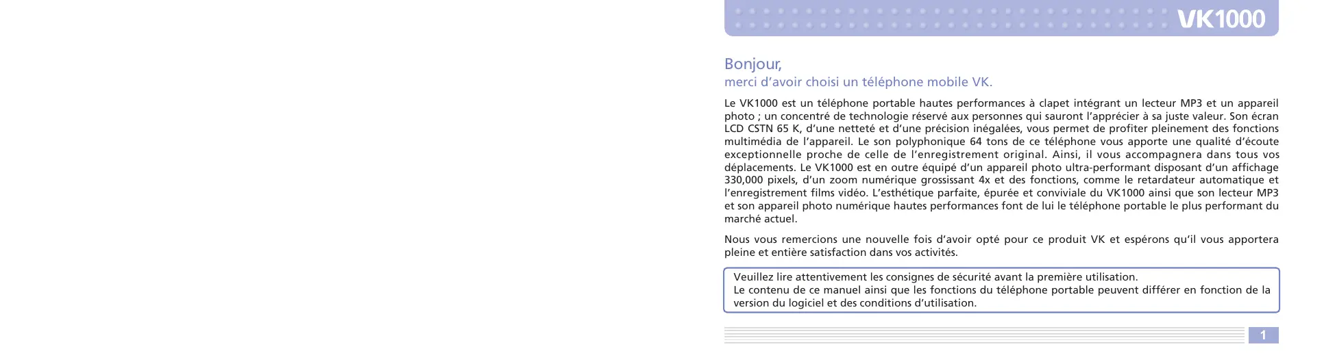 Bonjour, merci d'avoir choisi un téléphone mobile VK. Le VK1000 est un téléphone portable hautes performances à clapet intégrant un lecteur MP3 et un appareil photo ; un concentré de technologie réservé aux personnes qui sauront l'apprécier à sa juste valeur. Son écran LCD CSTN 65 K, d'une netteté et d'une précision inégalées, vous permet de profiter pleinement des fonctions multimédia de l'appareil. Le son polyphonique 64 tons de ce téléphone vous apporte une qualité d'écoute exceptionnelle proche de celle de l'enregistrement original. Ainsi, il vous accompagnera dans tous vos déplacements. Le VK1000 est en outre équipé d'un appareil photo ultra-performant disposant d'un affichage 330,000 pixels, d'un zoom numérique grossissant 4x et des fonctions, comme le retardateur automatique et l'enregistrement films vidéo. L'esthétique parfaite, épurée et conviviale du VK1000 ainsi que son lecteur MP3 et son appareil photo numérique hautes performances font de lui le téléphone portable le plus performant du marché actuel. Nous vous remercions une nouvelle fois d'avoir opté pour ce produit VK et espérons qu'il vous apportera pleine et entière satisfaction dans vos activités. Veuillez lire attentivement les consignes de sécurité avant la première utilisation. Le contenu de ce manuel ainsi que les fonctions du téléphone portable peuvent différer en fonction de la version du logiciel et des conditions d'utilisation.