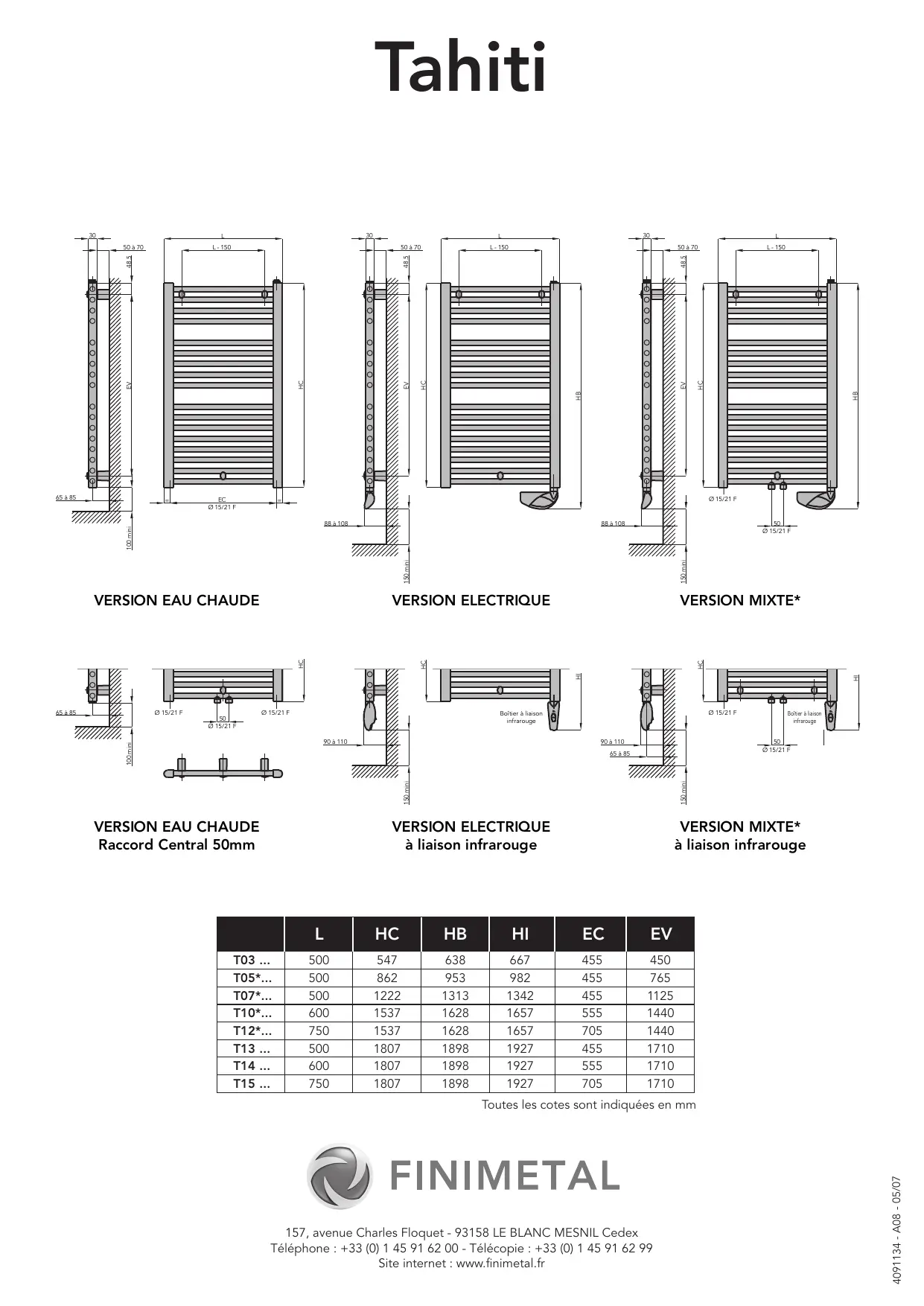 Toutes les cotes sont indiquées en mm 157, avenue Charles Floquet - 93158 LE BLANC MESNIL Cedex Téléphone : +33 (0) 1 45 91 62 00 - Télécopie : +33 (0) 1 45 91 62 99 Site internet : www.finimetal.fr 4091134 - A08 - 05/07