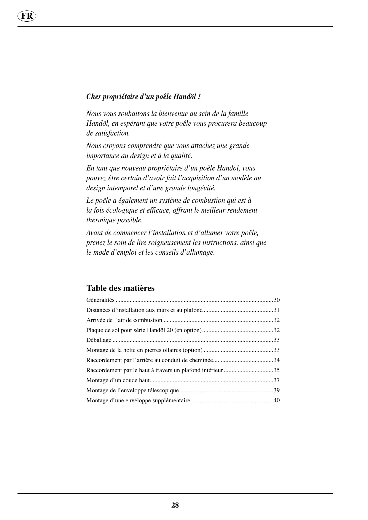 Ces instructions concernent le mode d'assemblage et d'installation des modèles Handöl 25/25T. Le poèle est livré avec des instructions d'allumage et un mode d'emploi. Nous vous engageons à lire soigneusement ces documents et à les conserver pour une évientuelle consultation future.