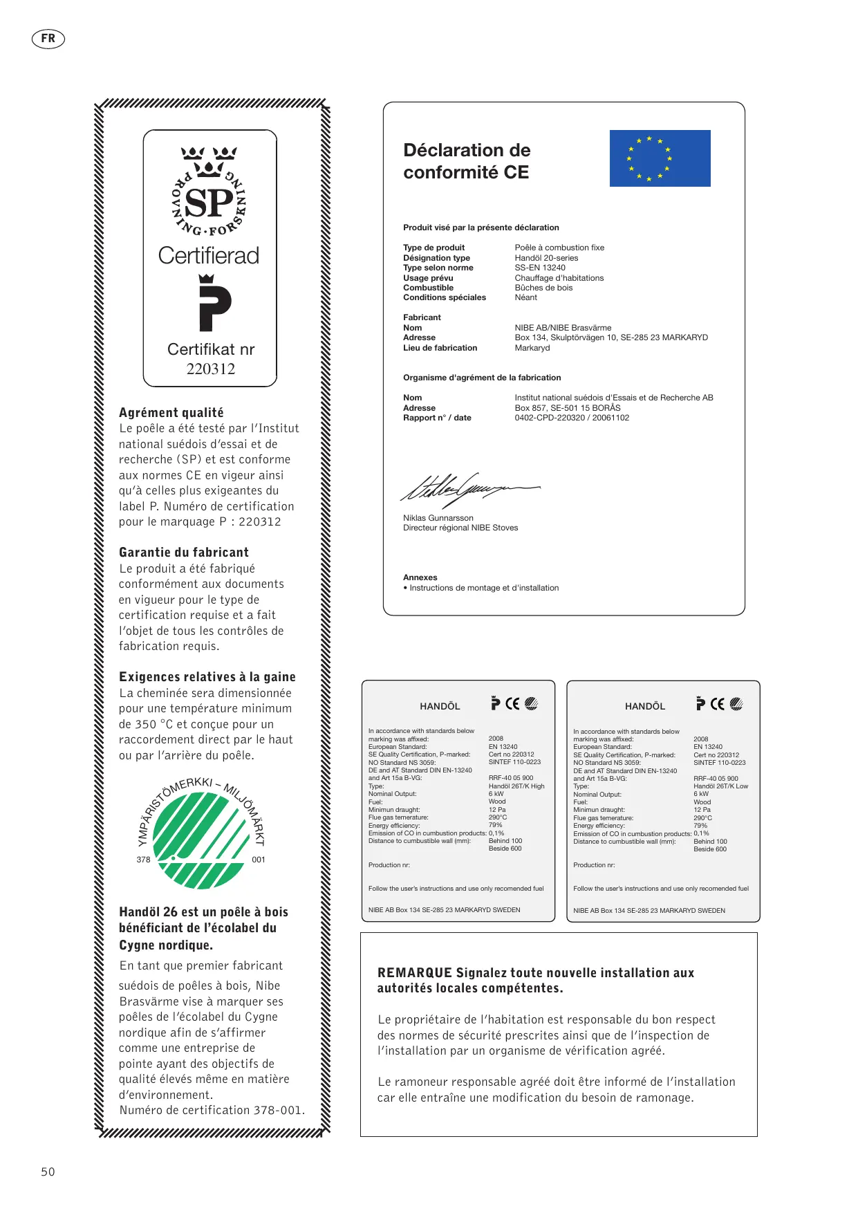 Type de produit Désignation type Type selon norme Usage prévu Combustible Conditions spéciales Poêle à combustion fixe Handöl 20-series SS-EN 13240 Chauffage d'habitations Bûches de bois Néant Fabricant Nom Adresse Lieu de fabrication NIBE AB/NIBE Brasvärme Box 134, Skulptörvägen 10, SE-285 23 MARKARYD Markaryd Organisme d'agrément de la fabrication Nom Adresse Rapport n° / date Institut national suédois d'Essais et de Recherche AB Box 857, SE-501 15 BORÅS 0402-CPD-220320 / 20061102 Niklas Gunnarsson Directeur régional NIBE Stoves Annexes