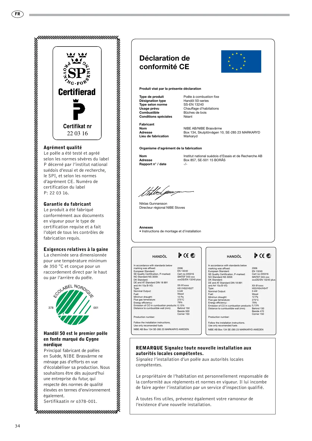 Type de produit Désignation type Type selon norme Usage prévu Combustible Conditions spéciales Poêle à combustion fixe Handöl 50-series SS-EN 13240 Chauffage d'habitations Bûches de bois Néant Fabricant Nom Adresse Lieu de fabrication NIBE AB/NIBE Brasvärme Box 134, Skulptörvägen 10, SE-285 23 MARKARYD Markaryd Agrément qualité Le poêle a été testé et agréé selon les normes sévères du label P décerné par l’institut national suédois d’essai et de recherche, le SPI, et selon les normes d’agrément CE. Numéro de certification du label P: 22 03 16. Organisme d'agrément de la fabrication Garantie du fabricant Le produit a été fabriqué conformément aux documents en vigueur pour le type de certification requise et a fait l’objet de tous les contrôles de fabrication requis. Niklas Gunnarsson Directeur régional NIBE Stoves