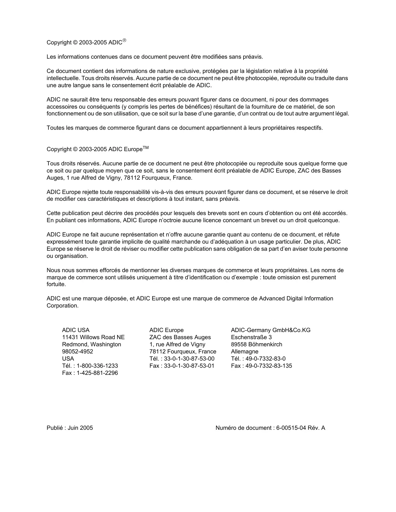Copyright © 2003-2005 ADIC Europe'M Tous droits réservés. Aucune partie de ce document ne peut être photocopiée ou reproduite sous quelque forme que ce soit ou par quelque moyen que ce soit, sans le consentement écrit préalable de ADIC Europe, ZAC des Basses