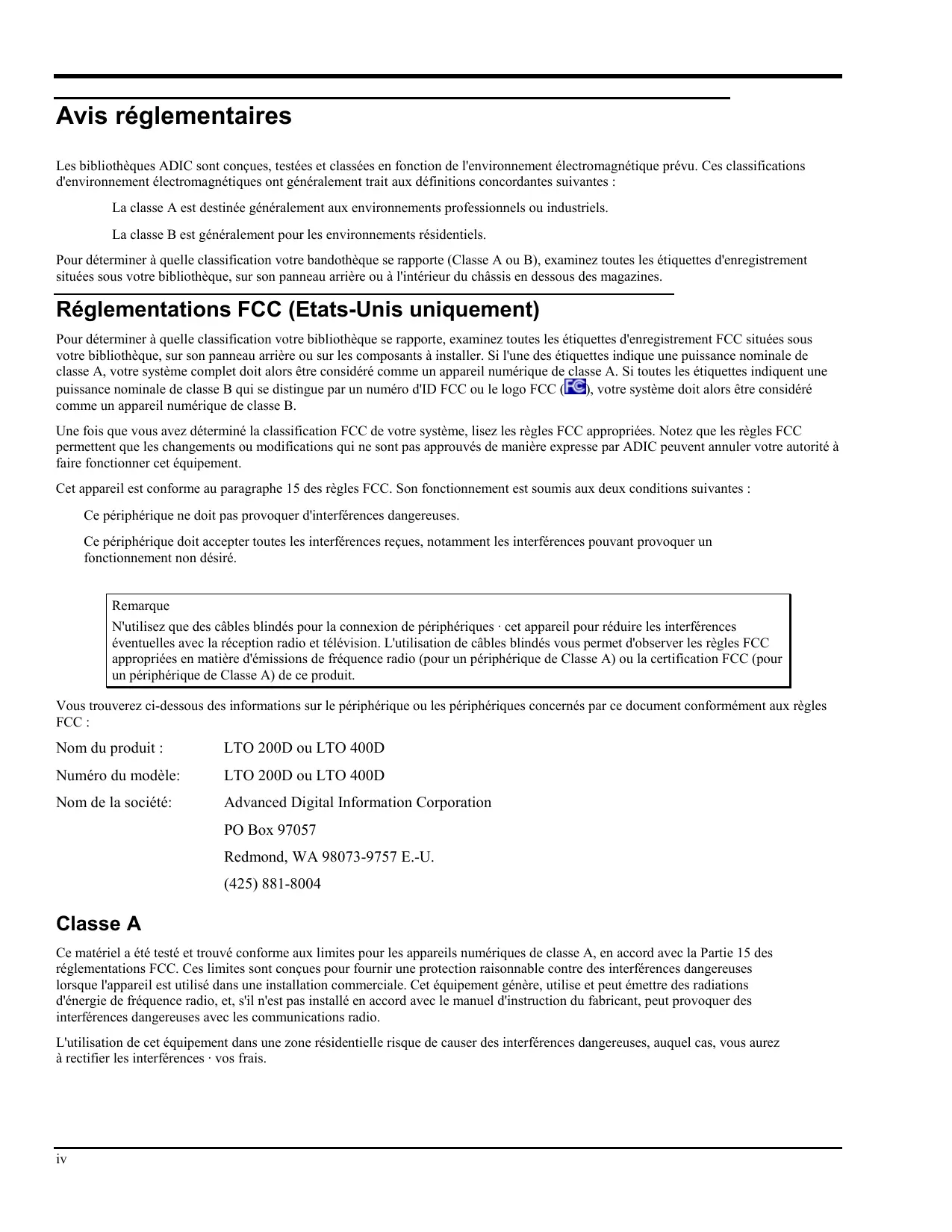 Pour déterminer à quelle classification votre bibliothèque se rapporte, examinez toutes les étiquettes d'enregistrement FCC situées sous votre bibliothèque, sur son panneau arrière ou sur les composants à installer. Si l'une des étiquettes indique une puissance nominale de classe A, votre système complet doit alors être considéré comme un appareil numérique de classe A. Si toutes les étiquettes indiquent une puissance nominale de classe B qui se distingue par un numéro d'ID FCC ou le logo FCC ( ), votre système doit alors être considéré comme un appareil numérique de classe B. Une fois que vous avez déterminé la classification FCC de votre système, lisez les règles FCC appropriées. Notez que les règles FCC permettent que les changements ou modifications qui ne sont pas approuvés de manière expresse par ADIC peuvent annuler votre autorité à faire fonctionner cet équipement. Cet appareil est conforme au paragraphe 15 des règles FCC. Son fonctionnement est soumis aux deux conditions suivantes : Ce périphérique ne doit pas provoquer d'interférences dangereuses. Ce périphérique doit accepter toutes les interférences reçues, notamment les interférences pouvant provoquer un fonctionnement non désiré. Remarque N'utilisez que des câbles blindés pour la connexion de périphériques · cet appareil pour réduire les interférences éventuelles avec la réception radio et télévision. L'utilisation de câbles blindés vous permet d'observer les règles FCC appropriées en matière d'émissions de fréquence radio (pour un périphérique de Classe A) ou la certification FCC (pour un périphérique de Classe A) de ce produit. Vous trouverez ci-dessous des informations sur le périphérique ou les périphériques concernés par ce document conformément aux règles FCC :