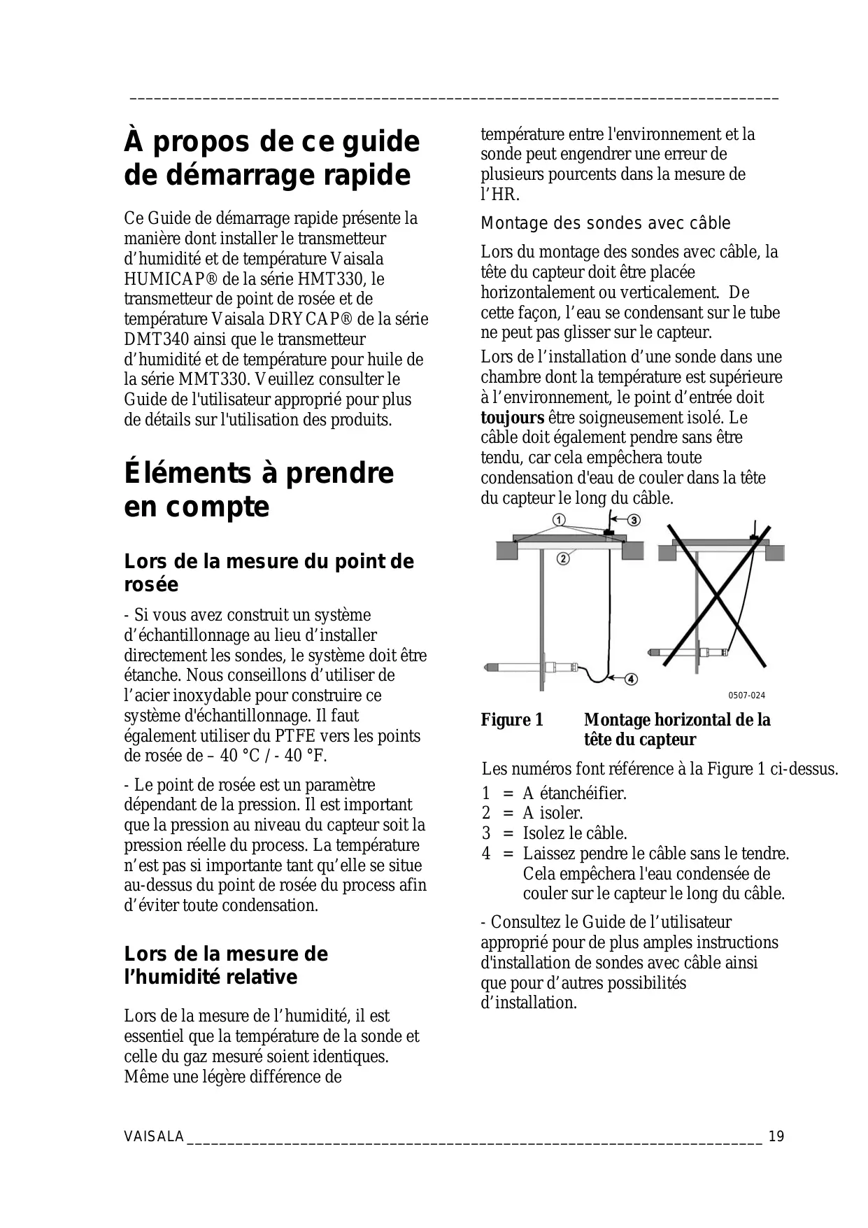 À propos de ce guide de démarrage rapide température entre l'environnement et la sonde peut engendrer une erreur de plusieurs pourcents dans la mesure de l’HR. Ce Guide de démarrage rapide présente la manière dont installer le transmetteur d’humidité et de température Vaisala HUMICAP® de la série HMT330, le transmetteur de point de rosée et de température Vaisala DRYCAP® de la série DMT340 ainsi que le transmetteur d’humidité et de température pour huile de la série MMT330. Veuillez consulter le Guide de l'utilisateur approprié pour plus de détails sur l'utilisation des produits. Montage des sondes avec câble Éléments à prendre en compte Lors du montage des sondes avec câble, la tête du capteur doit être placée horizontalement ou verticalement. De cette façon, l’eau se condensant sur le tube ne peut pas glisser sur le capteur. Lors de l’installation d’une sonde dans une chambre dont la température est supérieure à l’environnement, le point d’entrée doit toujours être soigneusement isolé. Le câble doit également pendre sans être tendu, car cela empêchera toute condensation d'eau de couler dans la tête du capteur le long du câble. Lors de la mesure du point de rosée - Si vous avez construit un système d’échantillonnage au lieu d’installer directement les sondes, le système doit être étanche. Nous conseillons d’utiliser de l’acier inoxydable pour construire ce système d'échantillonnage. Il faut également utiliser du PTFE vers les points de rosée de – 40 °C / - 40 °F. - Le point de rosée est un paramètre dépendant de la pression. Il est important que la pression au niveau du capteur soit la pression réelle du process. La température n’est pas si importante tant qu’elle se situe au-dessus du point de rosée du process afin d’éviter toute condensation. Lors de la mesure de l’humidité relative Lors de la mesure de l’humidité, il est essentiel que la température de la sonde et celle du gaz mesuré soient identiques. Même une légère différence de 0507-024 Figure 1 Montage horizontal de la tête du capteur Les numéros font référence à la Figure 1 ci-dessus. 1 = A étanchéifier. 2 = A isoler. 3 = Isolez le câble. 4 = Laissez pendre le câble sans le tendre. Cela empêchera l'eau condensée de couler sur le capteur le long du câble. - Consultez le Guide de l’utilisateur approprié pour de plus amples instructions d'installation de sondes avec câble ainsi que pour d’autres possibilités d’installation. VAISALA _______________________________________________________________________ 19