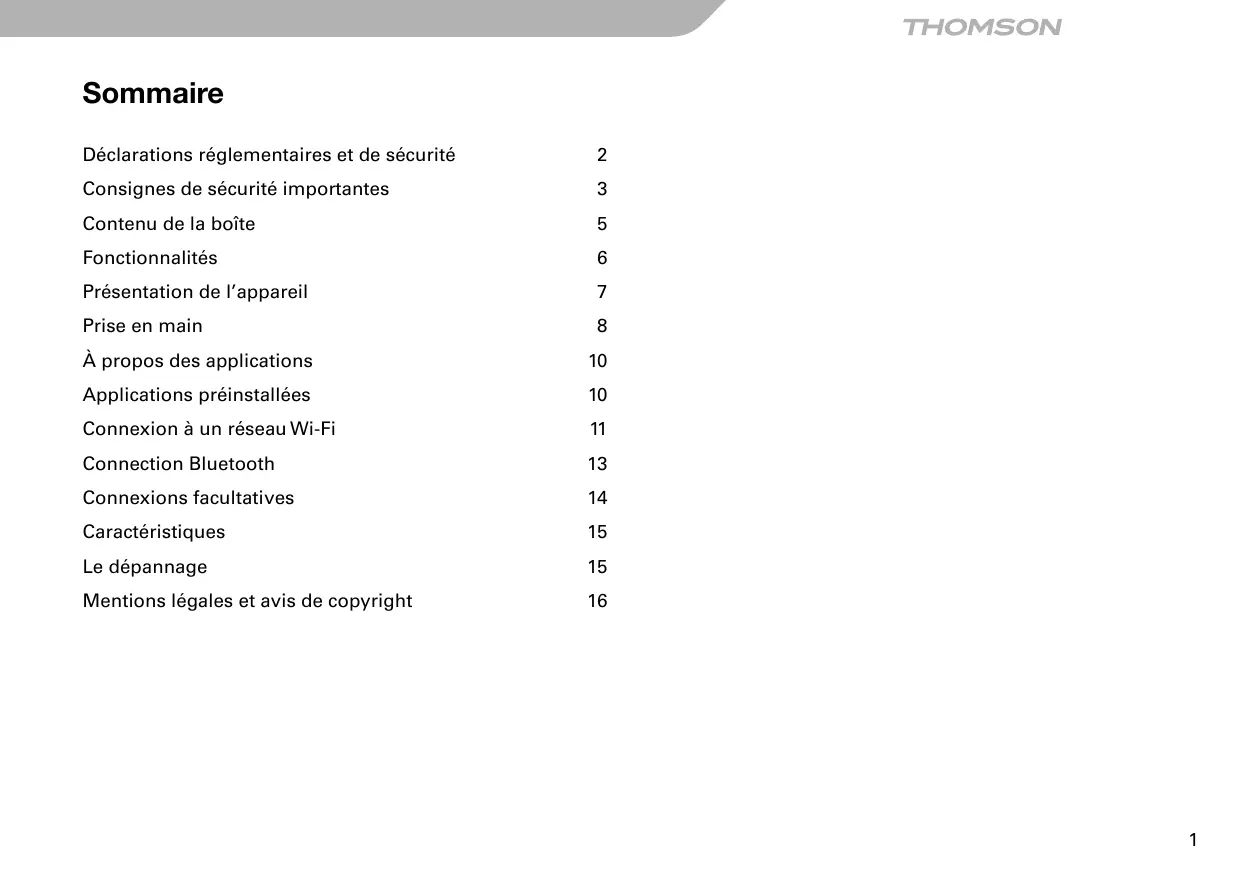 Mentions légales et avis de copyright Thomson est une marque de Technicolor ou de ses filiales utilisée sous licence par HDW EUROP. Google Play est une marque déposée. Tous les autres noms sont des marques de leurs propriétaires respectifs. Android est une marque commerciale de Google Inc. L’utilisation de cette marque de commerce doit être autorisée par Google. Certaines parties des illustrations du présent document sont des modifications reposant sur le travail créé et partagé par Google et utilisées conformément aux termes décrits dans la Licence d’attribution Creative Commons 3.0. microSD est une marque déposée de SD Card Association. USB est une marque déposée de USB Implementers Forum, Inc. YouTube™ est une marque de commerce de Google, Inc. Toutes les autres marques de commerce et logos sont la propriété de leurs propriétaires respectifs, sauf mention contraire. Fabriqué en RPC Importé par HDW FRANCE 157 Rue du Caporal Felix Poussineau
