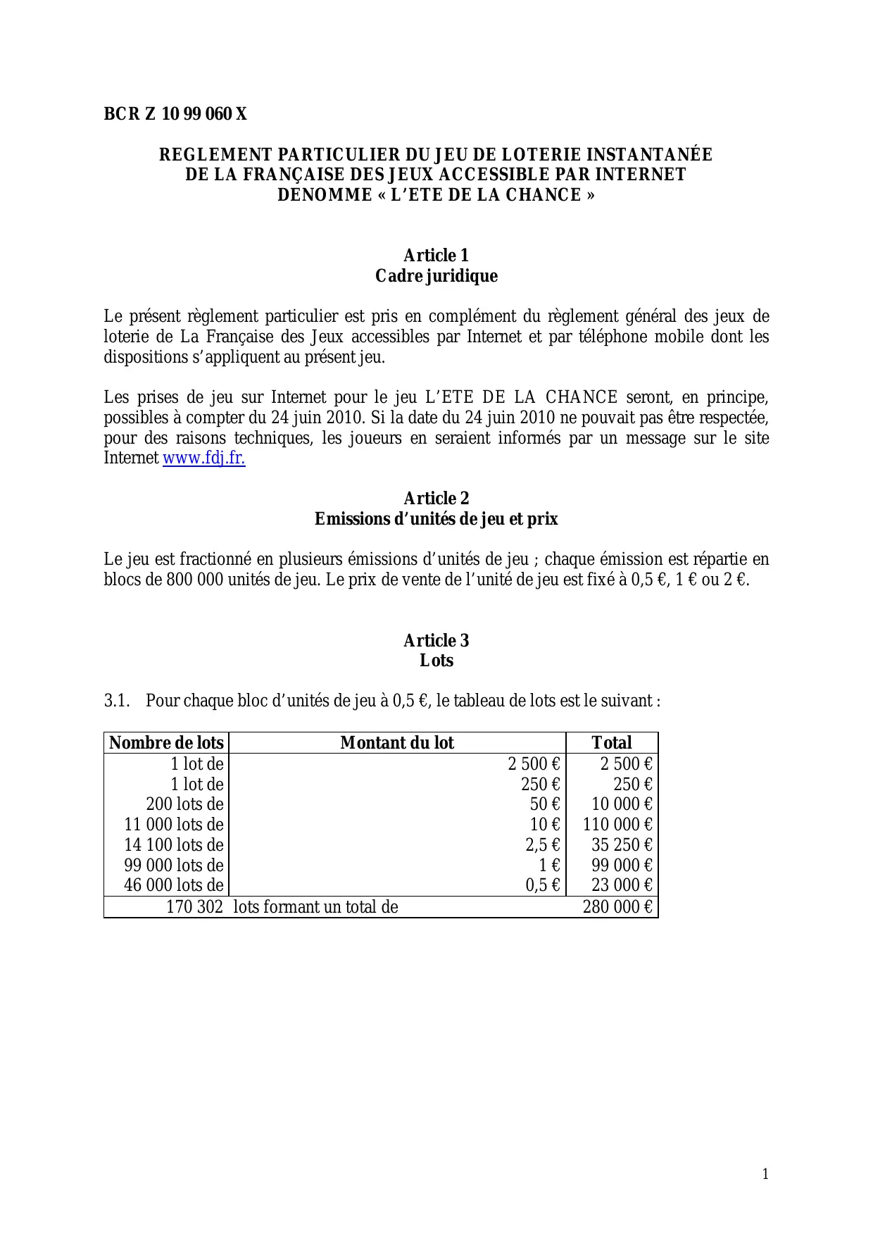 Article 1 Cadre juridique Le présent règlement particulier est pris en complément du règlement général des jeux de loterie de La Française des Jeux accessibles par Internet et par téléphone mobile dont les dispositions s’appliquent au présent jeu. Les prises de jeu sur Internet pour le jeu L’ETE DE LA CHANCE seront, en principe, possibles à compter du 24 juin 2010. Si la date du 24 juin 2010 ne pouvait pas être respectée, pour des raisons techniques, les joueurs en seraient informés par un message sur le site Internet www.fdj.fr. Article 2 Emissions d’unités de jeu et prix Le jeu est fractionné en plusieurs émissions d’unités de jeu ; chaque émission est répartie en blocs de 800 000 unités de jeu. Le prix de vente de l’unité de jeu est fixé à 0,5 €, 1 € ou 2 €. Article 3 Lots 3.1. Pour chaque bloc d’unités de jeu à 0,5 €, le tableau de lots est le suivant : Montant du lot Nombre de lots 1 lot de 1 lot de 200 lots de 11 000 lots de 14 100 lots de 99 000 lots de 46 000 lots de 170 302 lots formant un total de 2 500 € 250 € 50 € 10 € 2,5 € 0,5 € Total 2 500 € 250 € 10 000 € 110 000 € 35 250 € 99 000 € 23 000 € 280 000 €