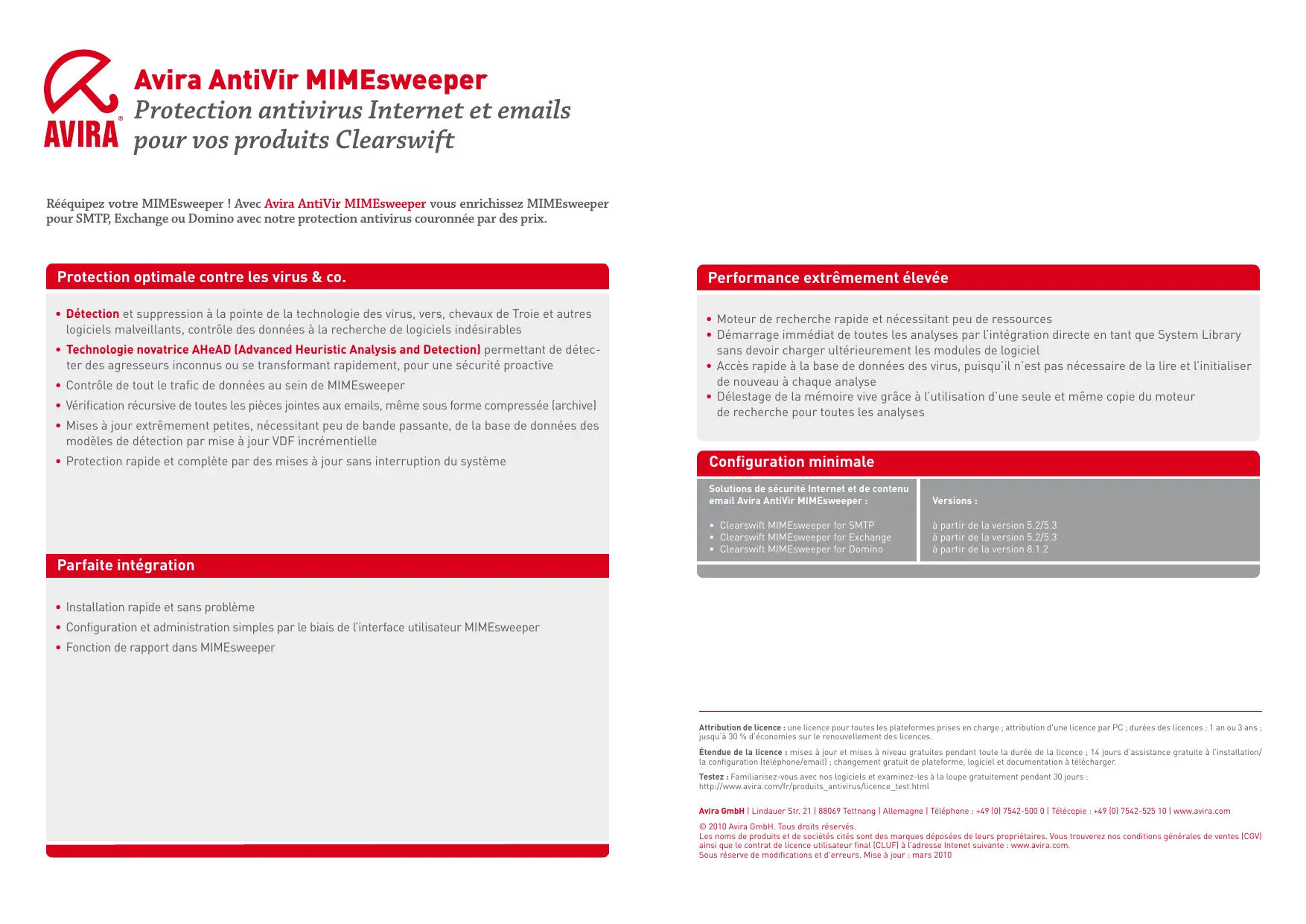 - Fonction de rapport dans MIMEsweeper Attribution de licence : une licence pour toutes les plateformes prises en charge ; attribution d'une licence par PC ; durées des licences : 1 an ou 3 ans ; jusqu’à 30 % d’économies sur le renouvellement des licences. Étendue de la licence : mises à jour et mises à niveau gratuites pendant toute la durée de la licence ; 14 jours d’assistance gratuite à l’installation/ la configuration (téléphone/email) ; changement gratuit de plateforme, logiciel et documentation à télécharger. Testez : Familiarisez-vous avec nos logiciels et examinez-les à la loupe gratuitement pendant 30 jours : http://www.avira.com/fr/produits_antivirus/licence_test.html Avira GmbH | Lindauer Str. 21 | 88069 Tettnang | Allemagne | Téléphone : +49 (0) 7542-500 0 | Télécopie : +49 (0) 7542-525 10 | www.avira.com © 2010 Avira GmbH. Tous droits réservés. Les noms de produits et de sociétés cités sont des marques déposées de leurs propriétaires. Vous trouverez nos conditions générales de ventes (CGV) ainsi que le contrat de licence utilisateur final (CLUF) à l’adresse Intenet suivante : www.avira.com. Sous réserve de modifications et d'erreurs. Mise à jour : mars 2010