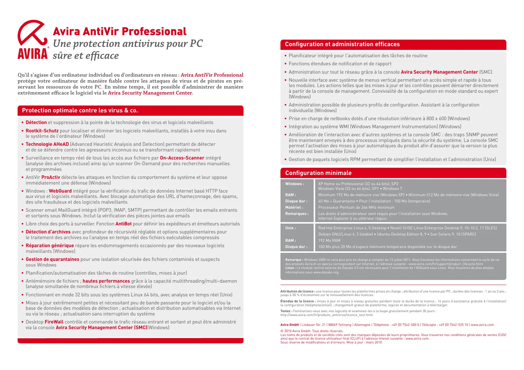 Avira AntiVir Professional Une protection antivirus pour PC AVIRA sûre et efficace Qu'il s'agisse d’un ordinateur individuel ou d'ordinateurs en réseau : Avira AntiVir Professional protège votre ordinateur de manière fiable contre les attaques de virus et de pirates en pré- servant les ressources de votre PC. En même temps, il est possible d'administrer de manière extrêmement efficace le logiciel via le Avira Security Management Center. Protecti on optimale contre Les virus & + Détection et suppression à la pointe de La technologie des virus et logiciels malveillants + Rootkit-Schutz pour localiser et éliminer Les logiciels malveillants, installés à votre insu dans Le système de l'ordinateur (Windows) + Technologie AHeAD [Advanced Heuristic Analysis and Detection] permettant de détecter et de se défendre contre les agresseurs inconnus ou se transformant rapidement + Surveillance en temps réel de tous les accès aux fichiers par On-Access-Scanner intégré {analyse des archives incluse] ainsi qu'un scanner On-Demand pour des recherches manuelles et programmées + AntiVir ProActiv détecte Les attaques en fonction du comportement du système et leur oppose immédiatement une défense (Windows) + Windows : WebGuard intégré pour La vérification du trafic de données Internet basé HTTP face aux virus et Logiciels malveillants. Avec blocage automatique des URL d'hameçonnage, des spams, des site frauduleux et des logiciels malveillants + Scanner email MailGuard intégré (POP3, IMAP, SMTP] permettant de contrôler Les emails entrants et sortants sous Windows. Inclut La vérification des pièces jointes aux emails + Libre choix des ports à surveiller. Fonction AntiBot pour définir Les expéditeurs et émetteurs autorisés + Détection d'archives avec profondeur de récursivité réglable et options supplémentaires pour le traitement des archives ou l'analyse en temps réel des fichiers exécutables compressés + Réparation générique répare les endommagements occasionnés par des nouveaux logiciels malveillants [Windows] + Gestion de quarantaines pour une isolation sécurisée des fichiers contaminés et suspects sous Windows + Planification/automatisation des tâches de routine (contrôles, mises à jour) + Antémémoire de fichiers ; hautes performances grâce à la capacité multithreading/multi-daemon {analyse simultanée de nombreux fichiers à vitesse élevée] + Fonctionnant en mode 32 bits sous les systèmes Linux 64 bits, avec analyse en temps réel [Unix] + Mises à jour extrêmement petites et nécessitant peu de bande passante pour le Logiciel et/ou la base de données des modèles de détection ; actualisation et distribution automatisables via Internet ou via Le réseau ; actualisation sans interruption du système + Desktop FireWall contrôle et commande le trafic réseau entrant et sortant et peut être administré via La console Avira Security Management Center (SMC)[Windows) Configuration et administration efficaces + Planificateur intégré pour l'automatisation des tâches de routine + Fonctions étendues de notification et de rapport + Administration sur tout Le réseau grâce à la console Avira Security Management Center (SMC) + Nouvelle interface avec système de menus vertical permettant un accès simple et rapide à tous les modules. Les actions telles que les mises à jour et les contrôles peuvent démarrer directement à partir de La console de management. Convivialité de La configuration en mode standard ou expert (Windows) Administration possible de plusieurs profils de configuration. Assistant à la configuration individuelle (Windows) Prise en charge de netbooks dotés d'une résolution inférieure à 800 x 600 (Windows) Intégration au système WMI [Windows Management Instrumentation] [Windows] Amélioration de l'interaction avec d'autres systèmes et La console SMC : des traps SNMP peuvent être maintenant envoyés à des processus impliqués dans la sécurité du système. La console SMC permet l'activation des mises à jour automatiques du produit afin d'assurer que la version La plus récente est bien installée [Unix] + Gestion de paquets logiciels RPM permettant de simplifier l'installation et l'administration (Unix) Configuration minimale Windows Minimum 192 Mo de m XP] + Minimum 512 Mo de m 40 Mo + Quarantaine + Pour l'installation : 100 Mo [temporaire] Matériel : cesseur Pentium de 266 MHz minimum Remarques : administrateur sont requis pour Internet Explorer 6 ou ultérieur requi Red Hat Enterprise Linux 4, 5 Desktop + Novell SUSE Linux Enterprise Desktop 9, 10-10.2, 11 (SLES GNU/Linux able] + Ubuntu Desktop Edition 8, 9 » Sun 192 Mo RAM 100 Mo plus 20 Mo d'espace mémoire temporaire disponible sur le disque dur informations Attribution de licence : une licence pour toutes Les plateformes prises en charge ; attribution d'une licence par PC ; durées des Licences : 1 an ou 3 ans jusqu'à 30 % d'économies sur le renouvellement des licences. Étendue de La licence : mises à jour et mises à niveau gratuites pendant toute La durée de La licence ; 1 jours d'assistance gratuite à linstalation/ la configuration (éléphonefemal; changement gratuit de latelorme, logiie et documentation à télécharger Testez: Familiarisez-vous avec nos logiciels et examinez-les à La loupe gratuitement pendant 30 jours http-/hwmen avira.comfr/produits_antivirus/licence_test.htrt Avira GmbH | Lindauer Str. 21 | 88069 Tetinang | Allemagne | Téléphone : +49 [0] 752-500 0 | Télécopie : +49 [0] 7542-25 10 | wwwavira.com © 2010 Avira GmbH. Tous droits réservés Les noms de produits et de sociétés cités sont des marques déposées de leurs propriétaires. Vous trouverez nos conditions générales de ventes [CG] ainsi que Le cantrat de licence utilisateur final (CLUFI à l'adresse Intenet suivante : ww avira.com. Sous réserve de modifications et d'erreurs. Mise à jour : mars 2010